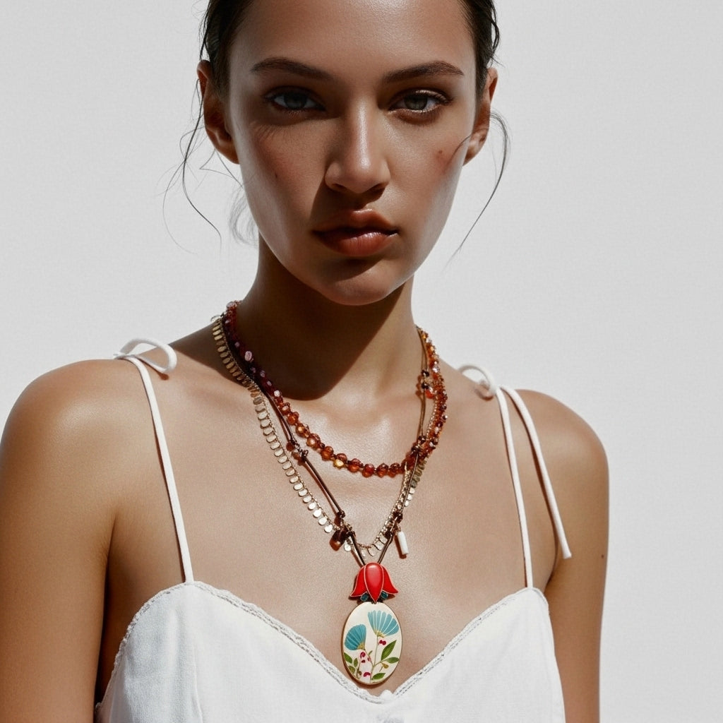 Amoria Bloom Kolye, doğanın zarafetini romantik bir ifadeyle sunan özel bir tasarım. Çok katmanlı yapısı, kahverengi tonların sıcaklığıyla renkli boncukların enerjisini buluştururken, çiçek motifli medalyon feminen bir imza parçası olarak öne çıkar.