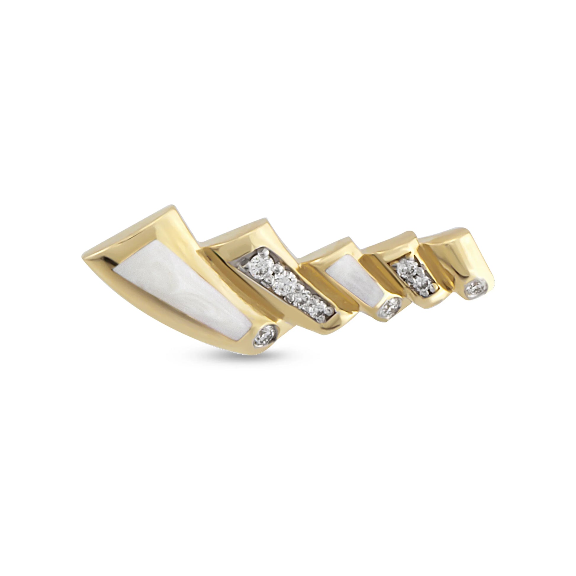 Anglera, adını “açı” kelimesinden alır ve geometrik formun estetikle nasıl dans edebileceğini gösterir. Altın gövde üzerinde kademeli şekilde yükselen açılar, sanki bir yapının yukarı doğru inşa edilmiş bölümleri gibi düzenli ve güçlüdür. İnci tonları ve pırlanta detaylar ise bu yapıya ışık ve yumuşaklık katar.