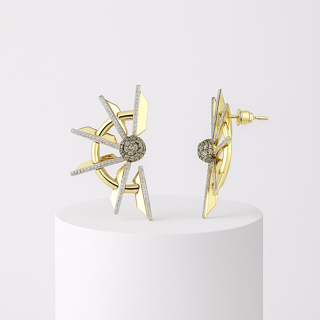 Astra Crescendo, yıldız patlamasının enerjisini modern geometrik çizgilerle birleştiren heykelsi bir küpe çiftidir. Işınımsal kollar, merkezde konumlanan yuvarlak kubbenin etrafında dengeli bir kompozisyon oluşturur; bu sayede küpe, hem önden hem yandan bakıldığında dikkat çekici bir derinlik hissi sunar. Hafif yapısı sayesinde gün boyu konforlu kullanım sağlar, ancak hacimli formu sayesinde görünürlükten ödün vermez.