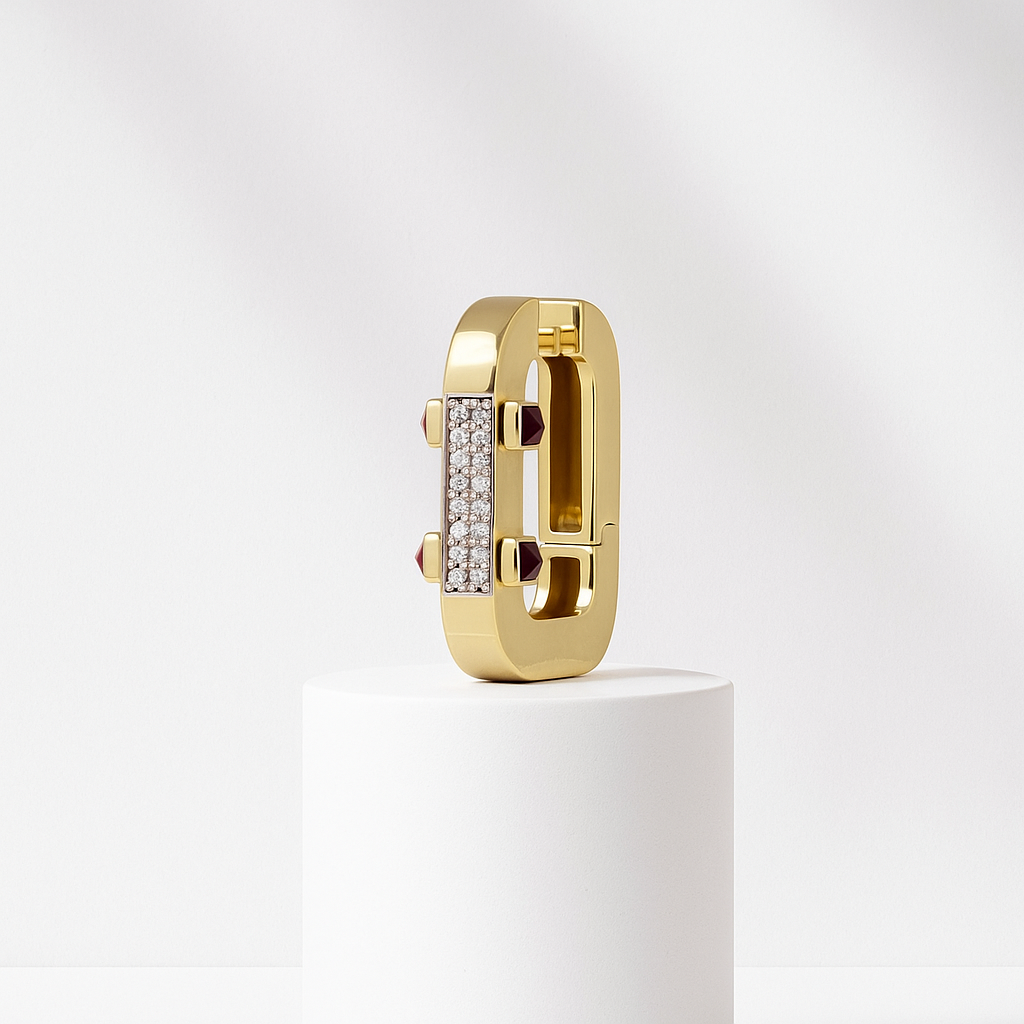 Carabine Rubis Küpe, teknik bir karabinayı andıran dikdörtgen hatlı gövdesine iki farklı lüks katmanı aynı anda yükler: Ön yüzeyi kaplayan mikro pavé kristaller, ışığı yüksek dozda geri yansıtırken yanlara sabitlenmiş kare kesim rubi bloklar tasarıma kesintisiz bir renk darbesi ekler. Parlatılmış altın tonlu çerçeve, mimari köşelerini yumuşatmadan bileği sıkmayan huggie kilit mekanizmasıyla gün boyu konfor sağlar; hem tek başına hem de diğer halka küpelerle katmanlandığında endüstriyel-şık bir odak noktası yaratır. Metal konstrüksiyonun keskin çizgisi ile rubinin doygun kırmızısı arasındaki kontrast, şehir temposuna cesur ama rafine bir imza atmak isteyenler için ideal.