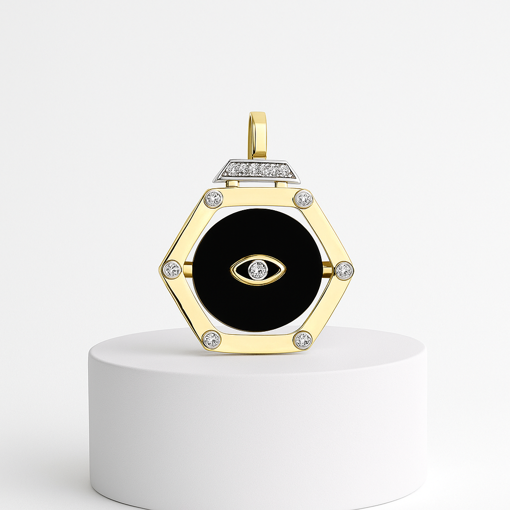 Altın çerçeve içinde derin oniks siyahının güçlü duruşunu taşıyan bu altıgen tasarım, merkezdeki göz motifiyle koruma ve sezgi sembolizmini bir araya getirir. Parlak taş detayları, koyu arka plan üzerinde çarpıcı bir kontrast yaratarak kolyeye hem lüks hem de gizemli bir hava katar. Dark Hex Kolye, minimal formda güçlü bir ifade arayanlar için sofistike bir seçimdir.