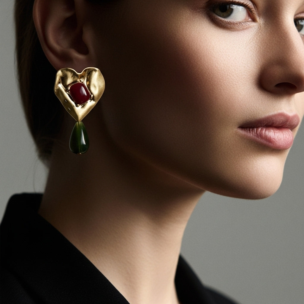 Étreinte Küpe, minimalizmin zarafetle buluştuğu ve modern tasarım anlayışının somut bir yansımasıdır. Organik formdaki kalp silueti, merkezdeki derin kırmızı taşla hayat bulur; bu taş tutkuyu ve duygusal derinliği simgeler. Kalbin ucundan zarifçe sarkan yeşil damla taş ise doğallığı ve yenilenmeyi temsil eder, tasarıma dingin bir akış katar. Altın tonlu yüzeyin hafif dokulu yapısı el işçiliği hissi verirken, parlak yüzey ışığı etkileyici şekilde yansıtır.