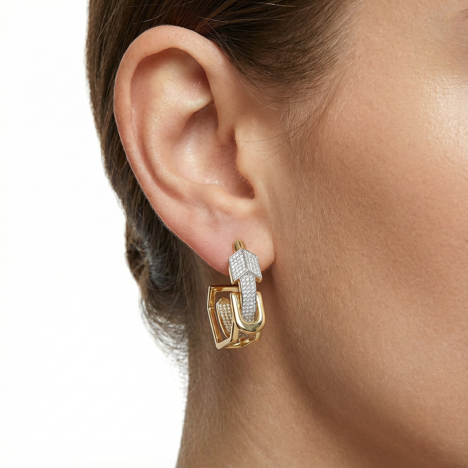 Artisanal Texture and Refined Opulence The Gilded Caviar Hoops are a celebration of tactile depth and exquisite craftsmanship. These half-hoop earrings feature a unique "caviar" beaded texture in radiant gold, providing a rich, organic feel that contrasts beautifully with their structured silhouette. A central panel of densely packed, pavé-set crystals is integrated into the golden surface, creating a brilliant focal point that radiates maximum light from every angle.