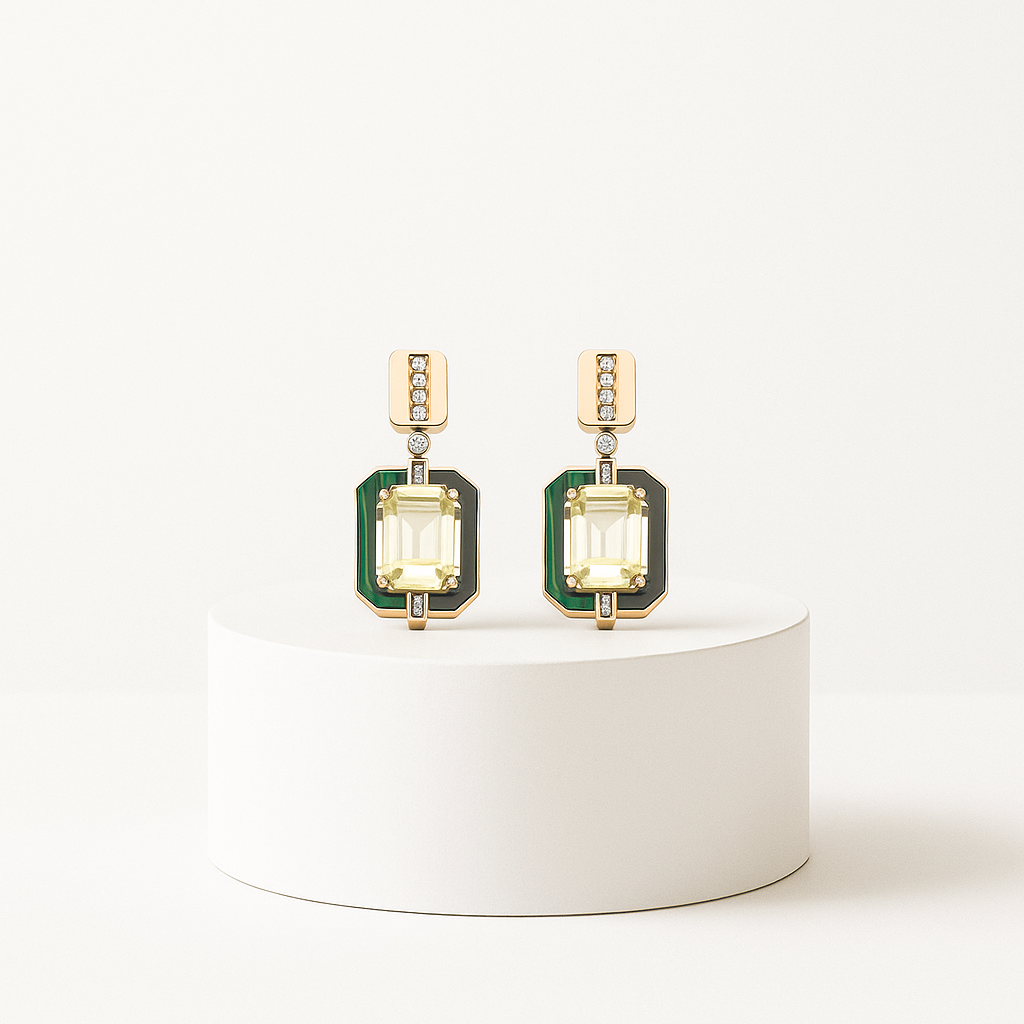 Malachora Küpe, derin malakit tonlarının zarafetiyle çevrelenmiş zümrüt kesim merkez taşı ve ince pırlanta dokunuşlarıyla, hem klasik hem modern bir duruş sergiler. Geometrik hatları art deco’dan ilham alırken, altın detayları tasarıma sıcak bir ihtişam katar. Her bakışta farklı bir aura, her ışıkta farklı bir enerji...
