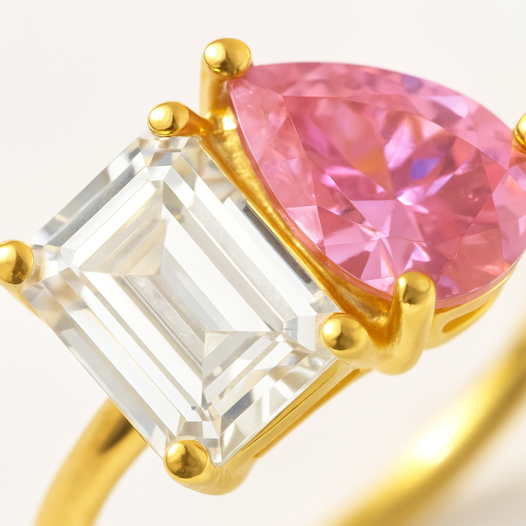 Pink Aurora Yüzük, şafak hattında birdenbire patlayan pembe ışık selini parmağa mühürler. Baguette kesim taşlar, altın kavis boyunca kuzey ışıkları gibi ardışık bir ritimle dizilir; merkezdeki damla form, geceyle gündüzün kesişiminde donmuş bir pembe kıvılcım gibi yükselir. Işık, ince kanalın içinde kesintisiz dolaşırken her mikro-harekette safir tonundan gül altın alevine genişleyen bir renk tayfı üretir. İnce profil, zarafeti hafifliğe borçludur fakat yüzüğün panoramik parlaklığı bakışları kilitlemekte acımasızdır.