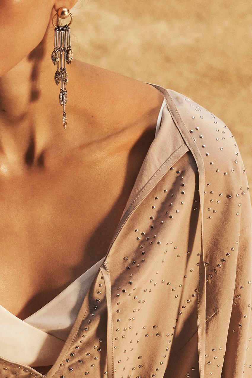 Gümüş ve altın tonlarının zarif uyumuyla tasarlanan bu uzun ve hareketli küpe, ince zincirler üzerinde sallanan yaprak formlarıyla yağmur damlalarının düşüşünü andırır. Işığı her açıdan yakalayan metal dokular, tasarıma hem sofistike hem de göz alıcı bir hava katar. Silver & Gold Rain Küpe, özel davetlerden günlük şıklığa kadar her stile modern ve etkileyici bir dokunuş ekler.