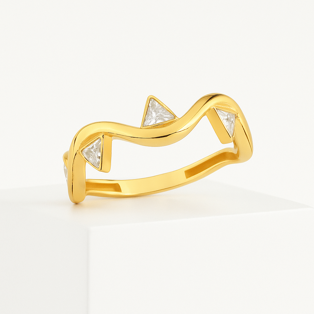 Spikeflow Yüzük, keskin çizgiler ile akışkan formların çarpıcı buluşmasını yansıtan cesur bir tasarımdır. Altın kaplama yüzey üzerinde dalgalanarak ilerleyen yapı, aralara ustalıkla yerleştirilmiş üçgen taşlarla modern ve dinamik bir enerji kazanır.