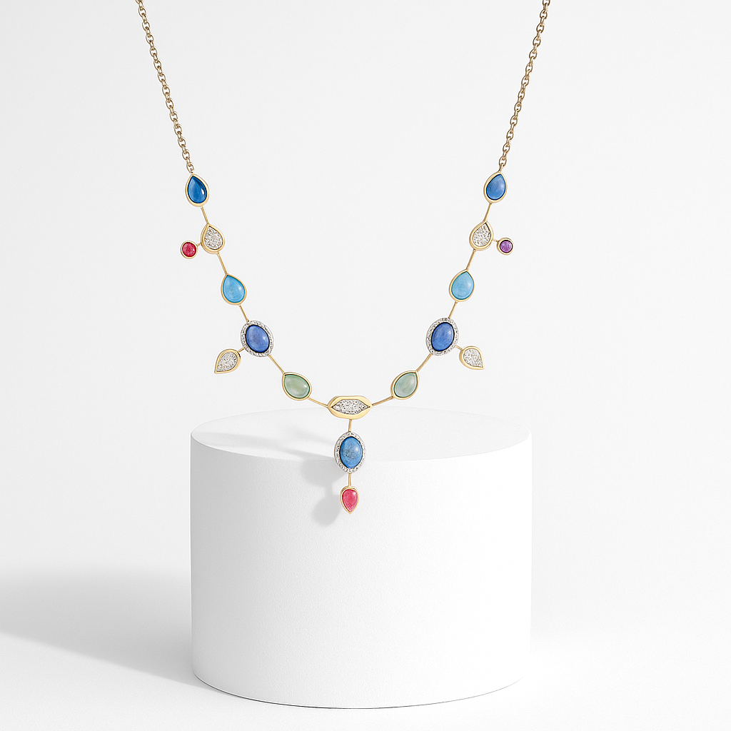 Stardust Sonata, yıldız tozuyla yazılmış bir melodiyi boynunuzda taşımanızı sağlar. Pastel tonlarda ışıldayan taşlar, her biri farklı bir ritmi temsil edercesine bir araya gelir. Mavi, yeşil, pembe ve opal yansımalar… Her biri ayrı bir duygunun, ayrı bir gecenin izdüşümüdür.