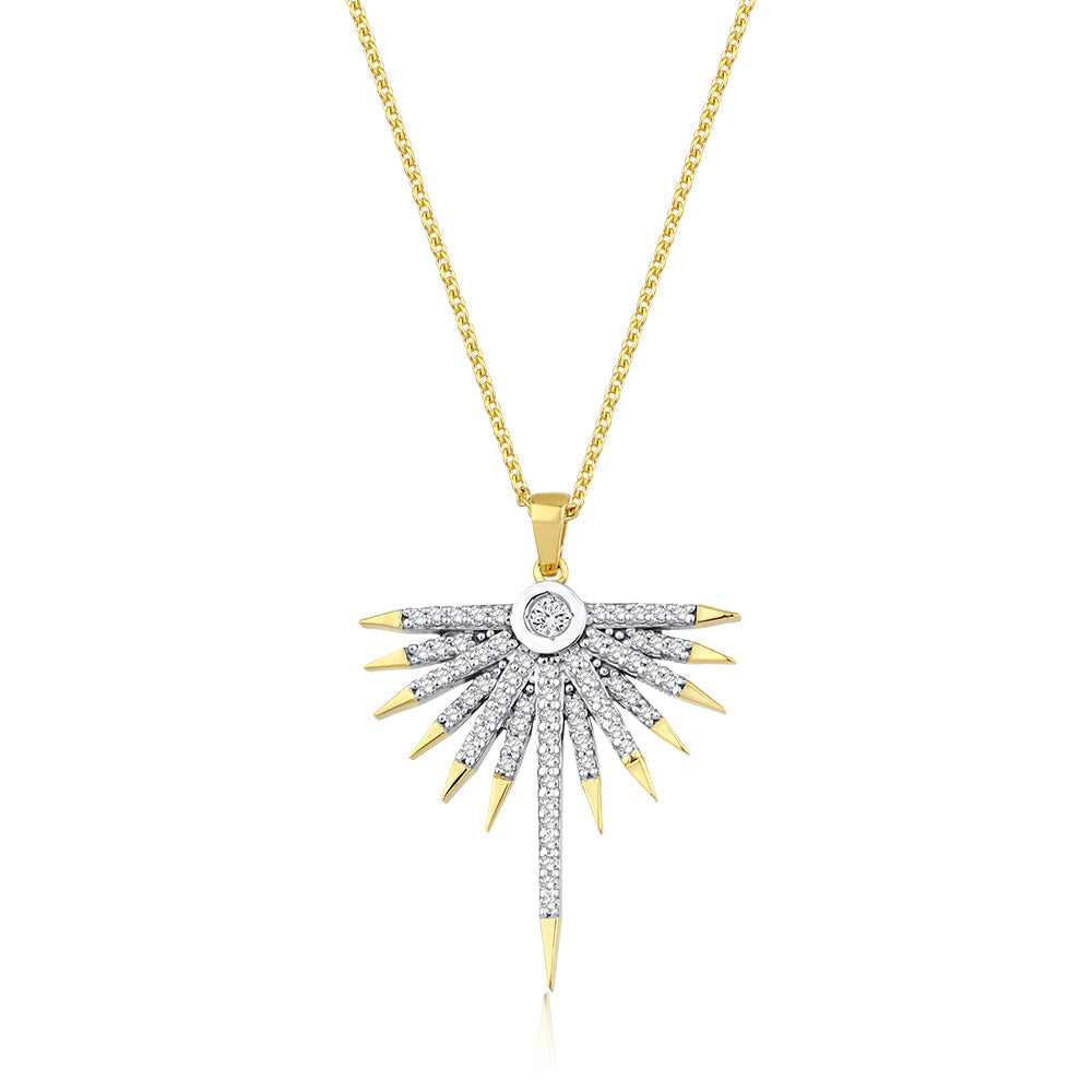 Stellare Dawn Kolye, ilk ışıkların ufukta belirdiği o büyüleyici anı takıya dönüştüren bir tasarım. Altın zinciri zarifçe boynu sararken, merkezdeki ışın formundaki detaylar gün doğumunun enerjisini ve tazeliğini yansıtıyor. Parlak taşlarla bezeli sivri uçlar, ışığın gökyüzüne yayılışını andırıyor ve kolyeye modern bir hareket katıyor.