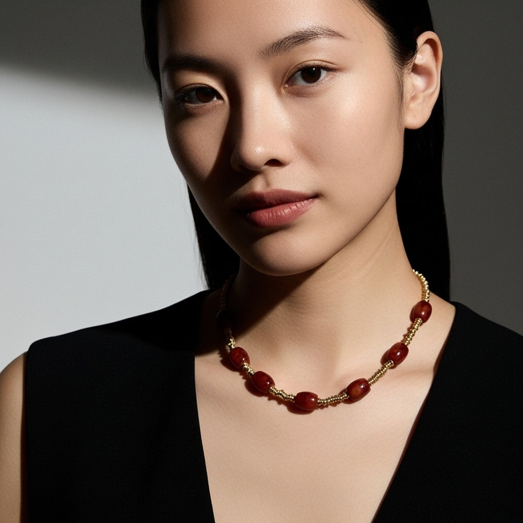 Toprağın sıcak tonlarını ve doğanın gizemli enerjisini taşıyan Terra Rosa Kolye, derin kırmızı doğal taşları ve altın sarma detaylarıyla dikkat çekiyor. Her bir taşın benzersiz damar yapısı ve el işçiliğiyle örülmüş halkalar, kolyeye özgün bir karakter kazandırıyor.