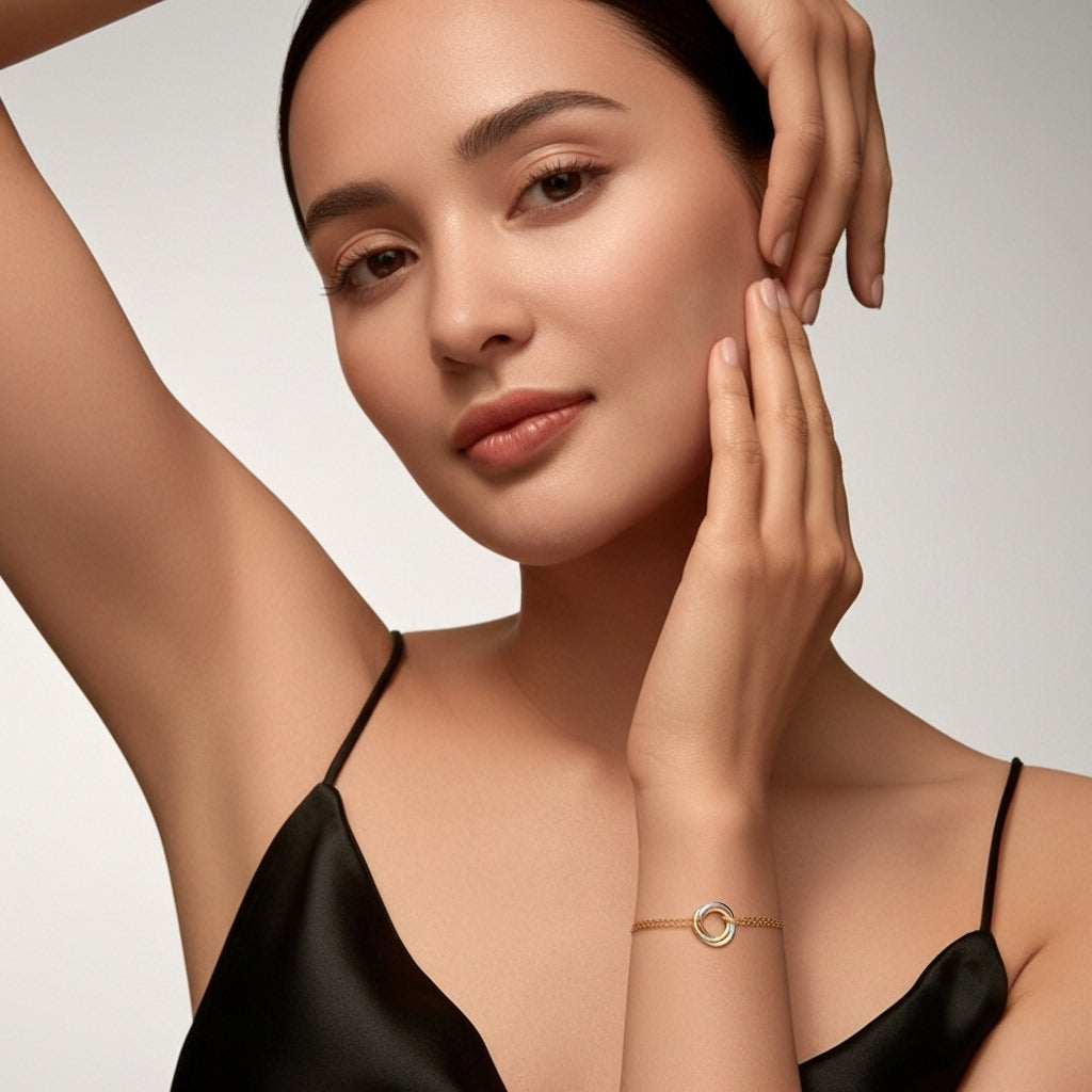 Üç rengin uyumlu birleşiminden ilham alan Unity Circle Bileklik, sarı altın, beyaz altın ve rose gold tonlarının zarif dengesiyle tasarlandı. Zincir ortasında yer alan halka detayı, birlik ve sonsuzluğu simgelerken modern ve sofistike bir şıklık sunar. Günlük stilinize ince bir zarafet katarken özel anlarda da anlamlı bir tamamlayıcı olur.