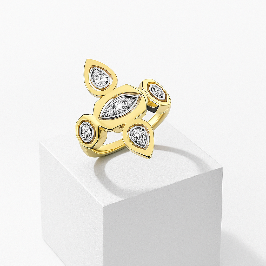 Vertex Brilliance Yüzük, çağdaş geometrik estetiği ve pırlanta parlaklığını bir araya getiriyor. Zirve formunu andıran keskin hatları, parmağınızda güçlü bir odak noktası oluştururken; taşların yerleştirildiği montür, ince işçilikle hazırlanarak ışığı en iyi şekilde yansıtıyor.