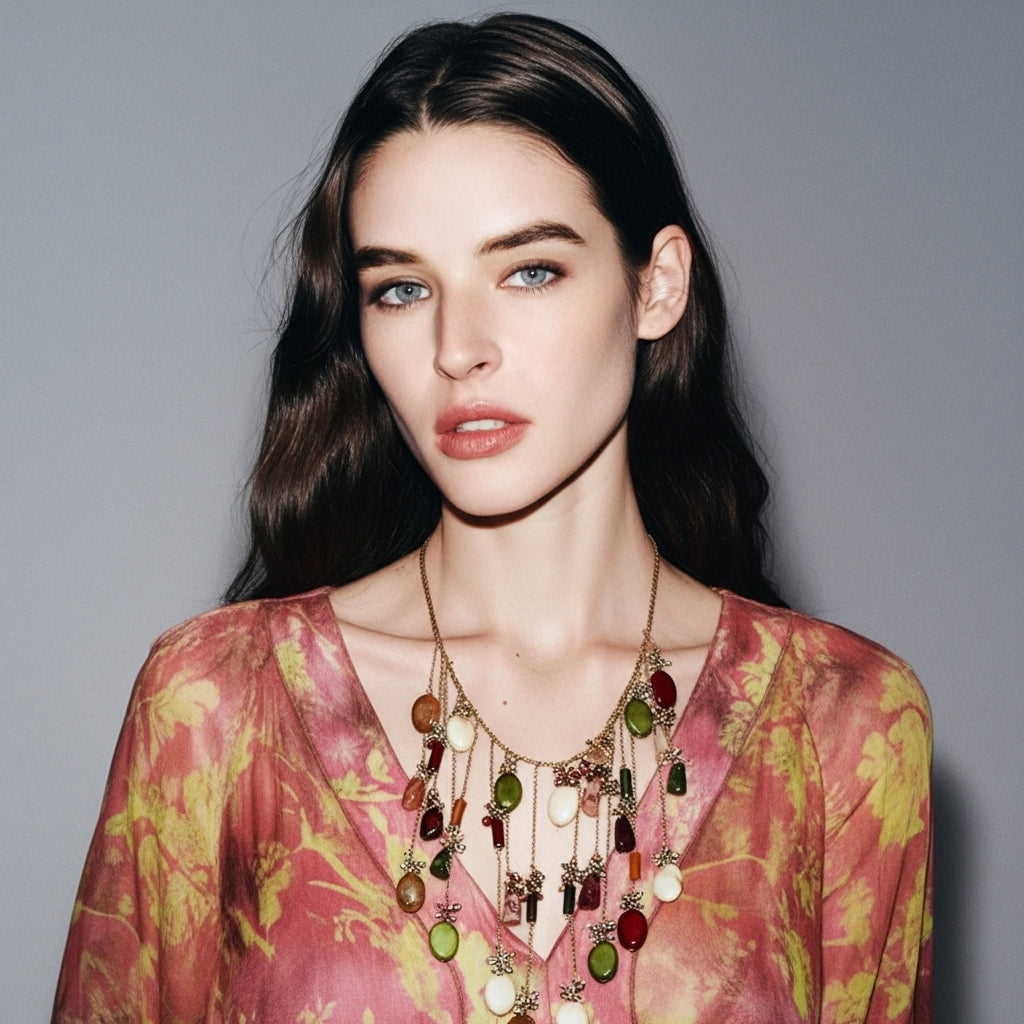 Vinea Luxe Kolye, doğanın zarif dallarını andıran sarkıntılı formu ve rengarenk taş detaylarıyla göz alıcı bir tasarım sunar. Her bir parça, özgün bir ritimle hareket ederek ışıltılı ve büyüleyici bir görünüm oluşturur.