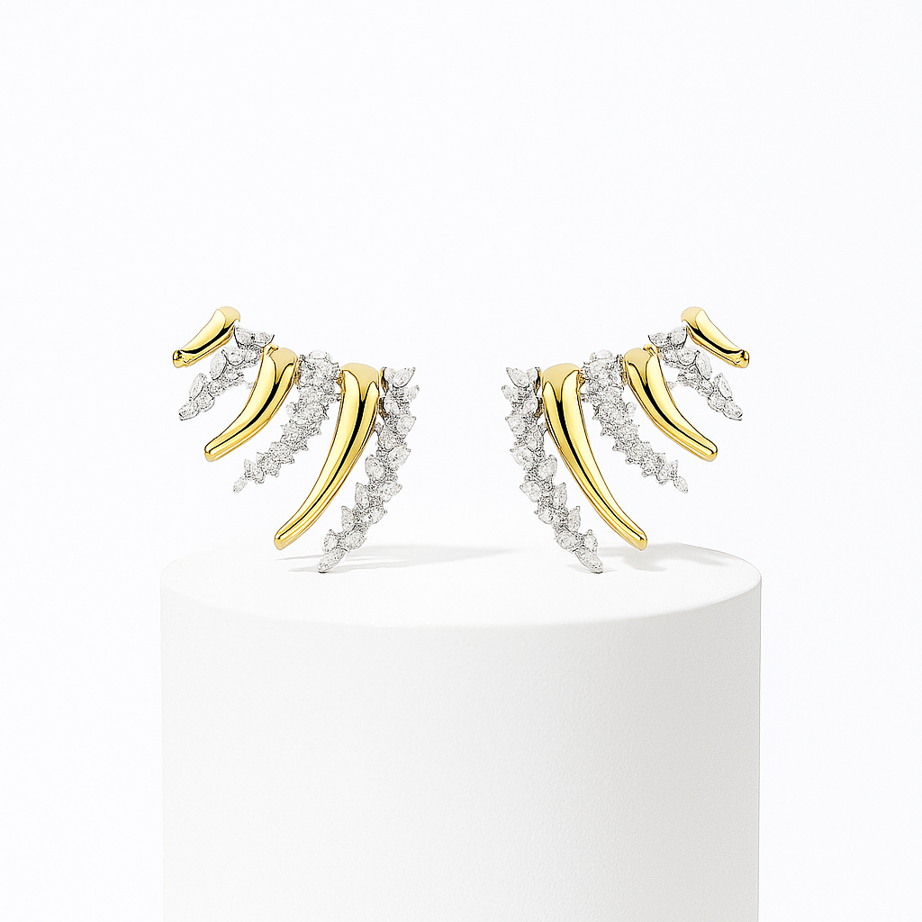 Altın kanat tüylerinin kıvrımını taklit eden parlak kıskanç “flare” kolları, kulak kepçenizi yukarı doğru tarayarak adeta ışık hızında bir kuyruklu yıldız izi bırakır. Her ince pençenin arasına serpiştirilen mikro kesim kristaller çarpıcı bir ombré ışıltı yaratırken, parlatılmış metal gövdeyle zıtlık kurup tasarıma havada süzülen bir hacim kazandırır. Kulak kenarına ergonomik biçimde oturan hafif yapı, gün boyu konfor sunar; görünmez menteşe ise hareketin akışını bozmadan güvenli bir kavrama sağlar. Wingflare, minimalist bir blazer’e asi bir parıltı, gece elbisesine göksel bir alev dokunuşu ekleyerek her kombini “uçuşa hazır” lükse taşır.