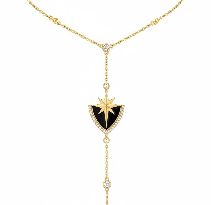 Gizem ve ışığın büyüleyici birleşimi… Astra Noire Şahmeran, siyah zemin üzerinde yükselen altın yıldız motifiyle gökyüzünün en parlak anlarını zarafetle yansıtır. Parlak taşlarla çevrelenen kalkan formu, gücü ve korunmayı simgelerken; ince zincir detayları modern bir şıklık kazandırır. Özel davetlerden günlük şıklığa kadar her kombinde dikkat çekici bir dokunuş sunan bu tasarım, karanlıkla ışığın kusursuz dengesini stilinize taşır.