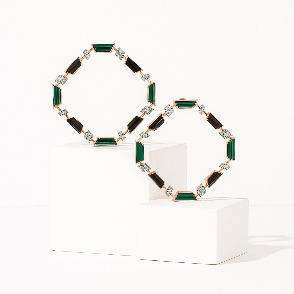 Astral Duality Küpe, malakit ve oniks taşlarının çarpıcı uyumuyla stilinize kozmik bir dokunuş katıyor. Modern tasarım ve özenli işçilik sayesinde, hem günlük kombinlerinize hem de özel davetlere zarif bir ışıltı getiriyor. Yüksek kaliteli malzemesi ve göz alıcı kontrastı, bu küpeyi zamansız ve özgün bir aksesuar haline dönüştürüyor.