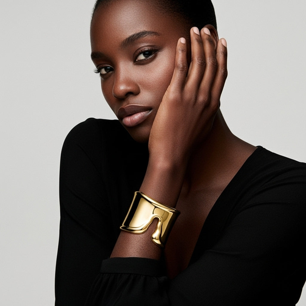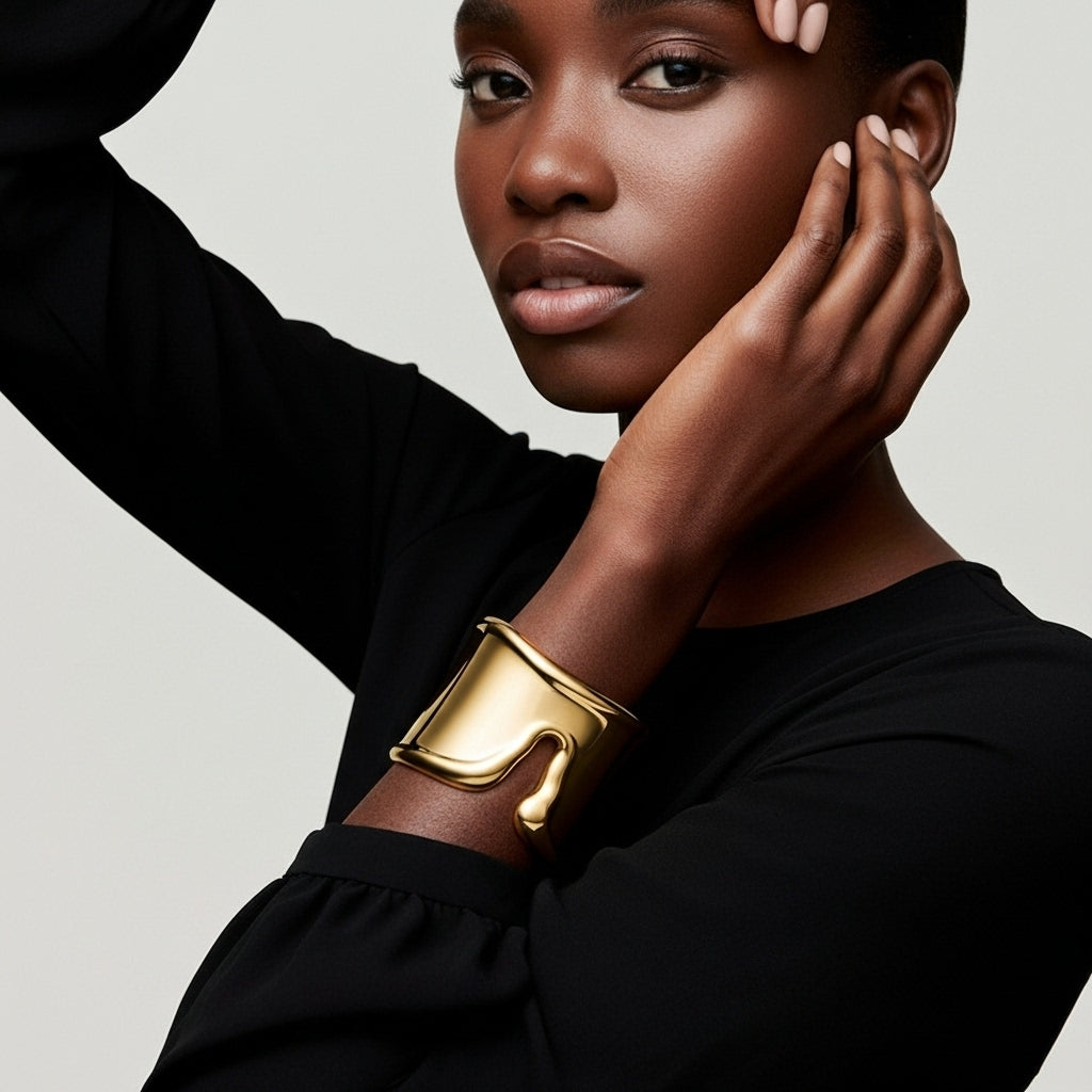 Zamansız şıklığı modern bir sanat dokunuşuyla buluşturan Auric Motion Kelepçe, akışkan formu ve parlak altın tonuyla güçlü bir estetik sunar. Heykelsi tasarımı, bileğinizde adeta canlı bir hareket hissi uyandırır. Hem gündüz hem gece kombinlerine sofistike bir dokunuş katan bu parça, cesur ve zarif tarzınızı yansıtmak için ideal bir seçimdir.