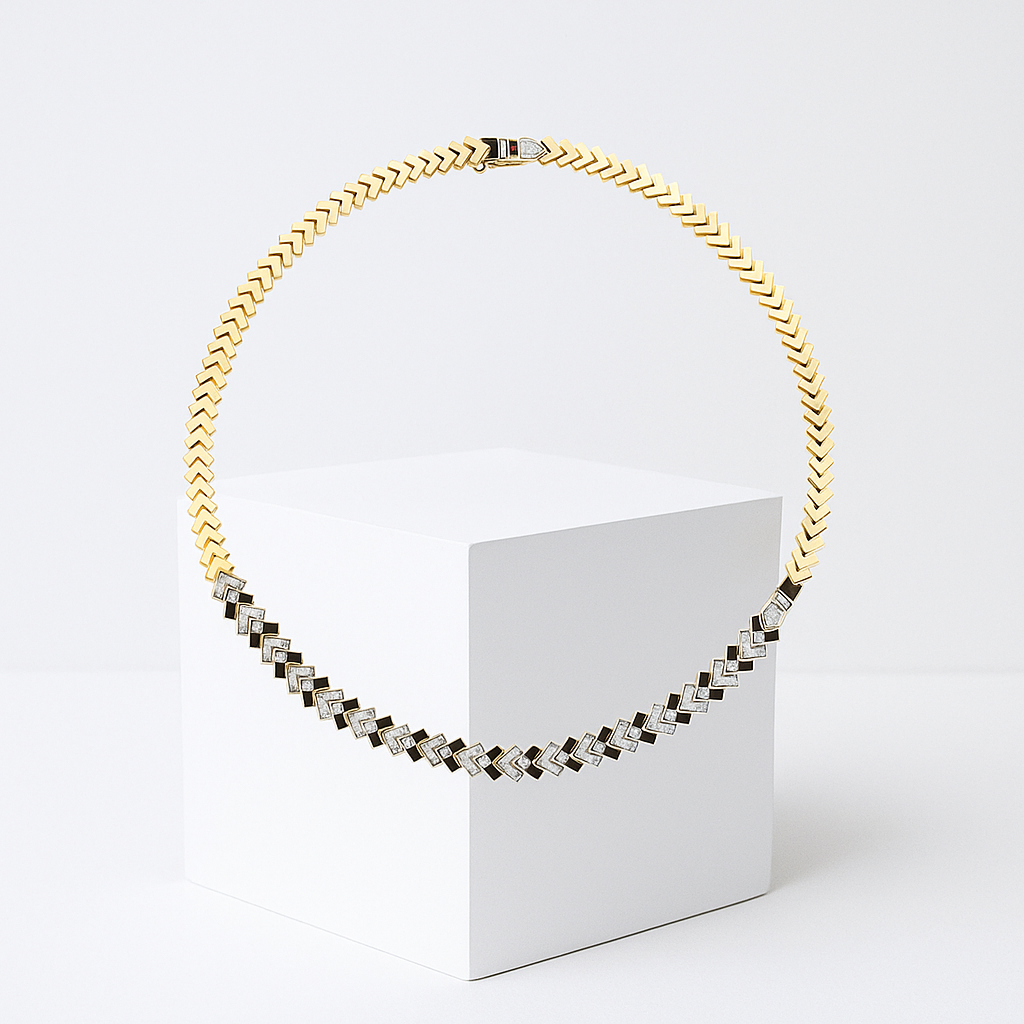 Black-Tie Kolye, Paris’in zarif saray atmosferini günümüz stil anlayışıyla buluşturan özgün bir tasarım. İnce ve akıcı hatlarla şekillendirilmiş metal zemin, parlak taş detaylarıyla adeta ışıldayan bir siluet oluşturur. Zarif montür, taşların doğal ışıltısını öne çıkarırken her hareketinizde boynunuzda nazikçe dans eden bir parlaklık sunar.