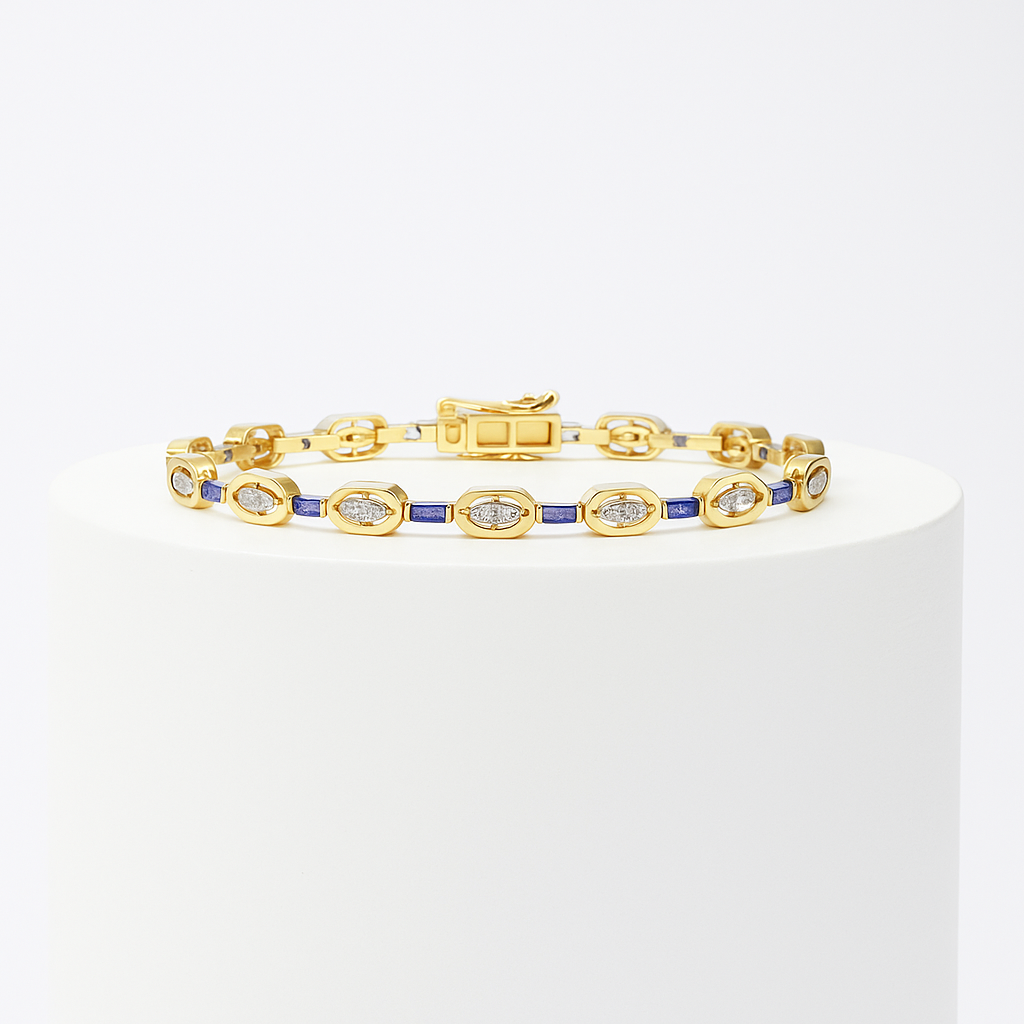 Blue Horizon Bileklik, safirin derin maviliğini ve pırlantanın parlaklığını modern çizgilerle harmanlayarak stilinize sofistike bir ufuk açıyor.