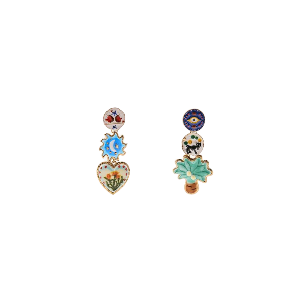 Bohem ruhun enerjisini, sembollerin büyüsünü ve özgürlüğün hissini taşıyan bir tasarım. Her bir motif; kalp, göz, çiçek, yıldız ve ay figürleri, koruma ve iyi enerjinin simgesi olarak bir araya geliyor. Sanatsal detaylarıyla her bakışta yeni bir hikâye anlatan bu küpe, sizi sadece bir takı değil, bir yolculuğun parçası olmaya davet ediyor.