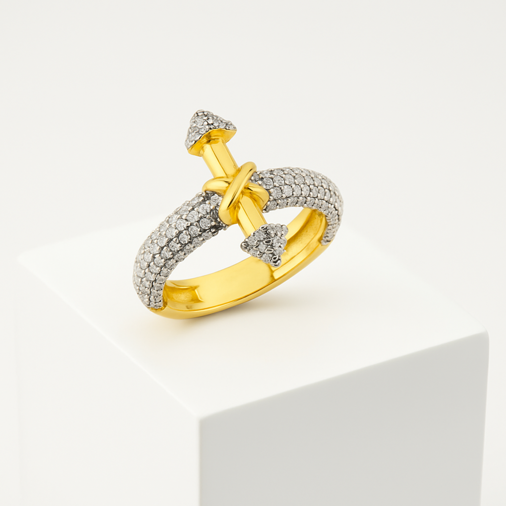 Boldmark Yüzük, gücün ve kararlılığın modern bir sembolü olarak tasarlandı. Parlak taşlarla kaplı geniş bant yapısı, göz alıcı bir ışıltı sunarken; ortadaki altın tonlu ok detayı, hedefe doğru kararlılıkla ilerlemeyi simgeler.
