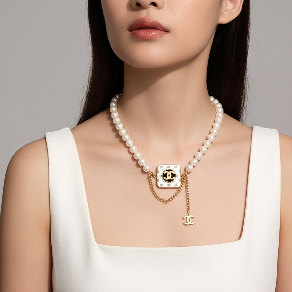 Château Kolye, ihtişamlı tasarımıyla kraliyet saraylarının zarafetini modern çizgilerle buluşturuyor. Saf inci tanelerinin simetrik düzeni, masumiyet ve asaleti yansıtırken, merkezdeki siyah-beyaz kontrastlı ikonik sembol güçlü bir karakter sergiliyor. Altın zincir detayları kolyeye hareket katarken aynı zamanda lüks bir vurgu ekliyor.