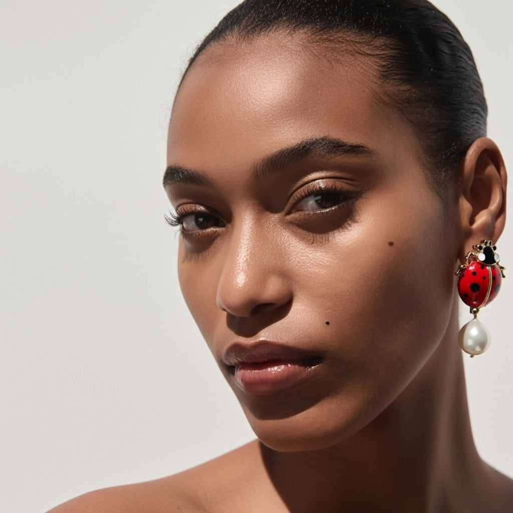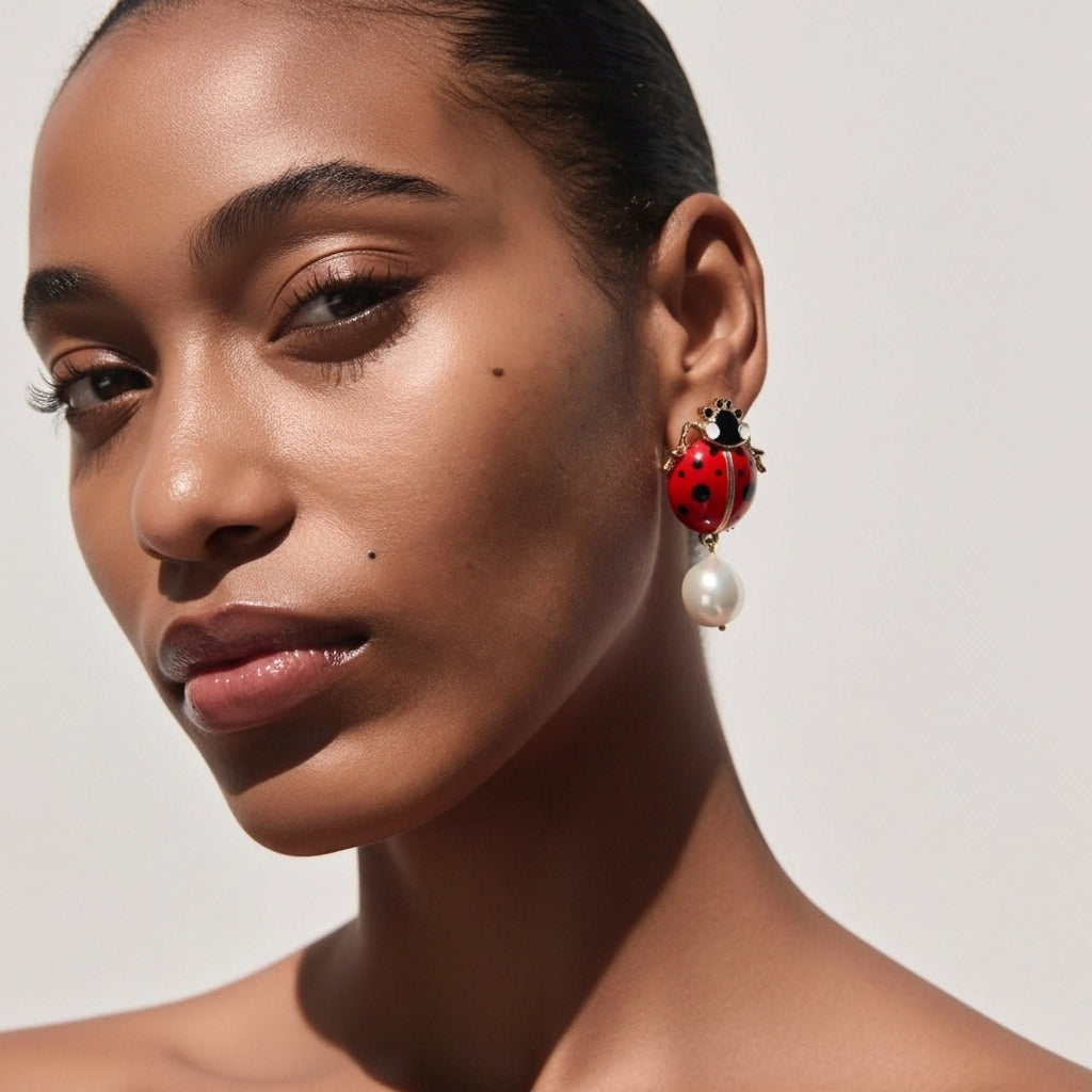 Doğanın en sevimli sembollerinden biri olan uğur böceğinin zarafetini ve şans getiren enerjisini modern bir yorumla kulağınıza taşıyor. Parlak kırmızı mine yüzeyi ve titizlikle işlenmiş siyah detayları ile her bakışta gülümseten bu tasarım, inci formundaki sallantılı ucu sayesinde feminen bir zarafet katıyor. Hem gündüz hem gece kombinlerine kolayca uyum sağlayan bu küpe, baharın tazeliğini ve iyi şansın enerjisini her an yanınızda hissetmenizi sağlıyor. Cesur ama sevimli, şık ama eğlenceli bir dokunuş arayanlar için ideal.