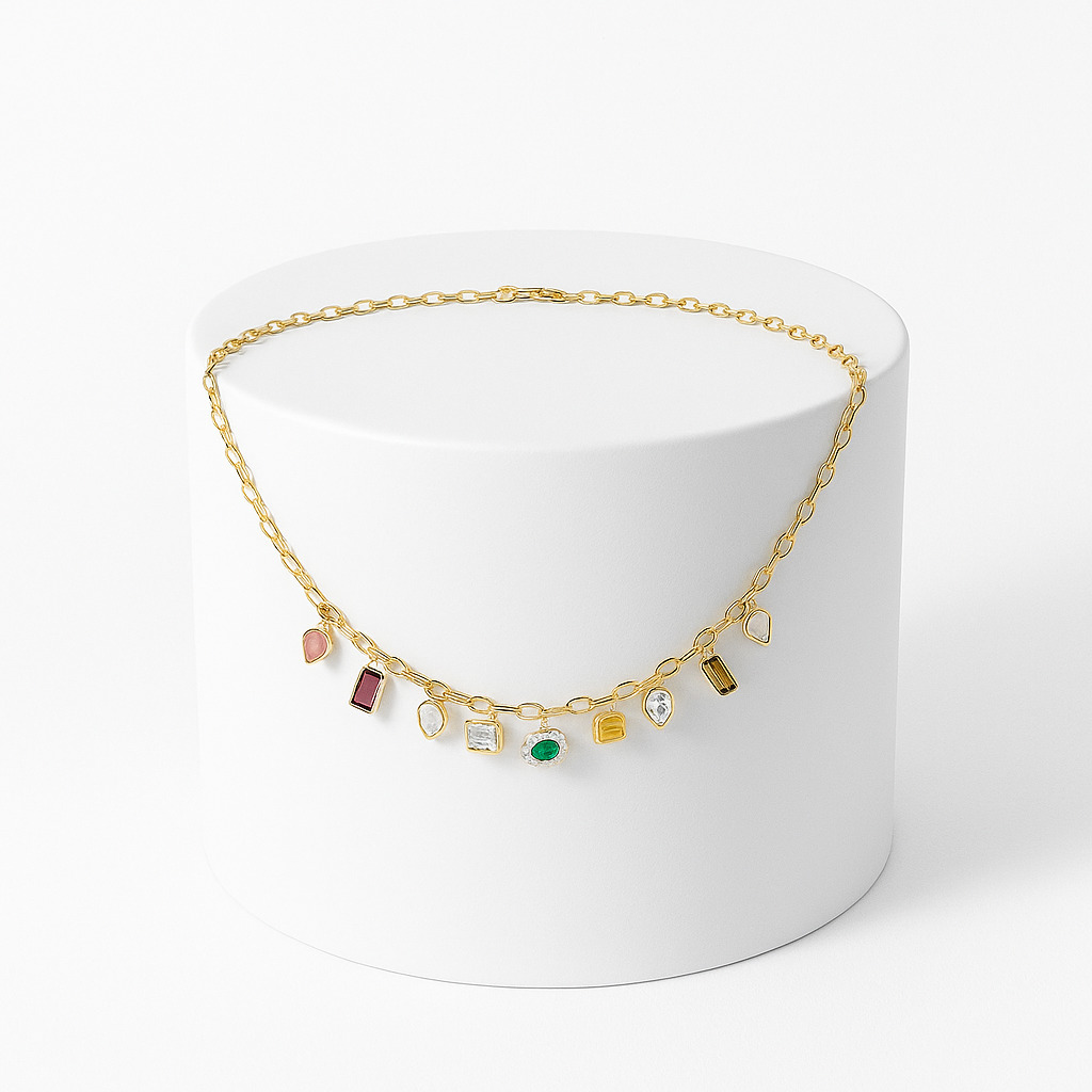 Colorcoded Kolye, renklerin ve formların kusursuz bir uyumla buluştuğu, modern ama zarif bir tasarımdır. Farklı kesimlerde ve tonlardaki taşların altın zincir üzerinde yan yana dizilimi, adeta renklerle kodlanmış bir stil mesajı taşır.
