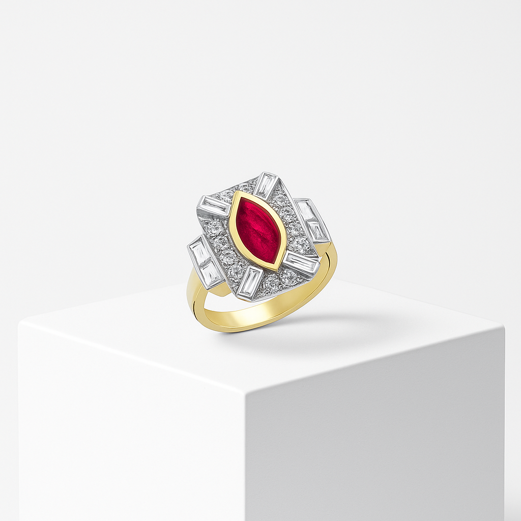 Bu özel tasarım yüzük, zengin kırmızı yakutun asaletini ve vintage esintilerin büyüleyici uyumunu yansıtıyor. Her detayında ustalıkla işlenen model, klasik zarafet ile modern şıklığı harmanlayarak sofistike bir görünüm sunuyor. Yüksek kaliteli malzemelerden üretilen bu yüzük, günlük kullanımdan özel davetlere kadar stilinizi ön plana çıkaracak. Crimson Majesty Yüzük, kendine güvenen ve fark yaratmayı sevenler için mükemmel bir tercih.