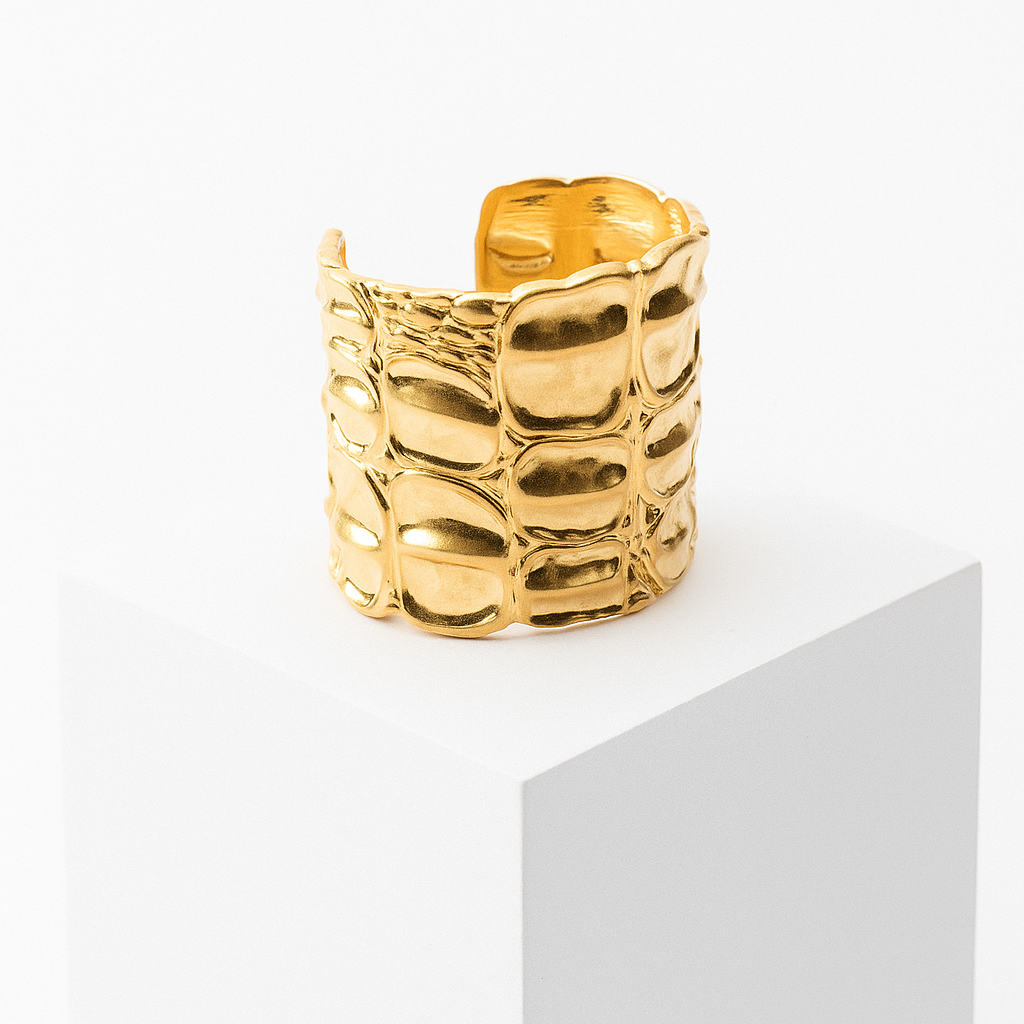 Croc Shine Kelepçe, krokodil derisinden ilham alan kabartmalı yüzeyi ve yüksek parlaklıkta altın kaplamasıyla dikkat çeken güçlü bir tasarımdır. Her bir dokulu detay, ışığı farklı açılardan yansıtarak bileğinizde cesur ama zarif bir ışıltı yaratır.