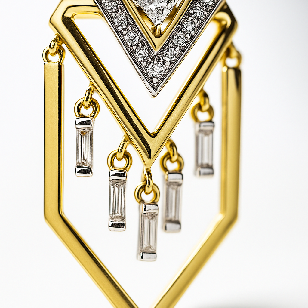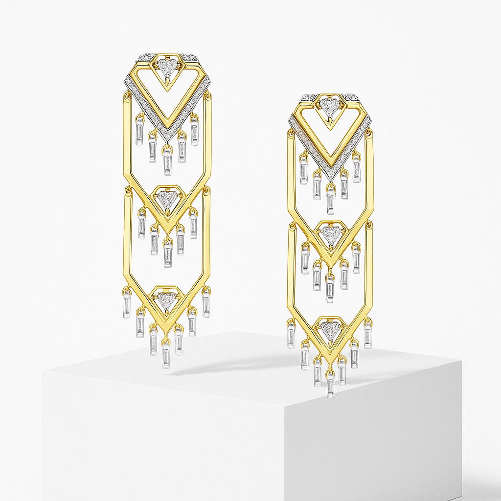 Crownfall, güçlü bir duruşun mücevhere dönüşmüş halidir. İhtişamlı üçgen formlar, her adımda zarifçe hareket eden taş detaylarla birleşir ve her bakışta fark edilen bir etki yaratır. Bu tasarım, bir kraliçenin tahtı terk edişini değil, gücünü yeniden tanımlayışını temsil eder.