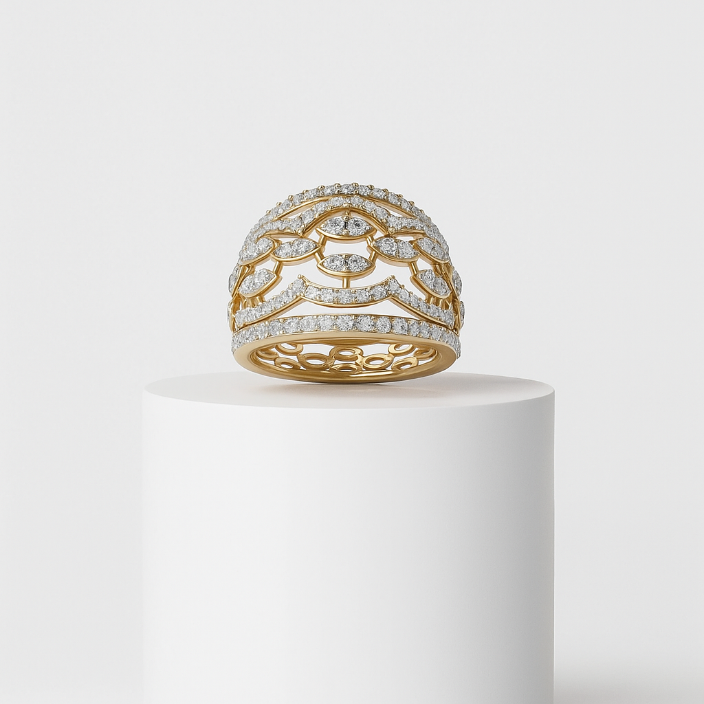 Diadème Treillis, ışıltıyı kubbe biçimli bir taç hâline getiriyor. Kademeli altın kemerler, gökyüzüne yükselen bir katedrali andırır; her katmana serpiştirilen pırlantalar, içten yanmalı bir vitray gibi parlayarak ışığı yukarı doğru taşır. Marquise kesim “göz” motifleri, tasarımın file dokusuna nefes aldırır: gün ışığında hafif, akşam spotlarında çarpıcı bir kristal ağ…