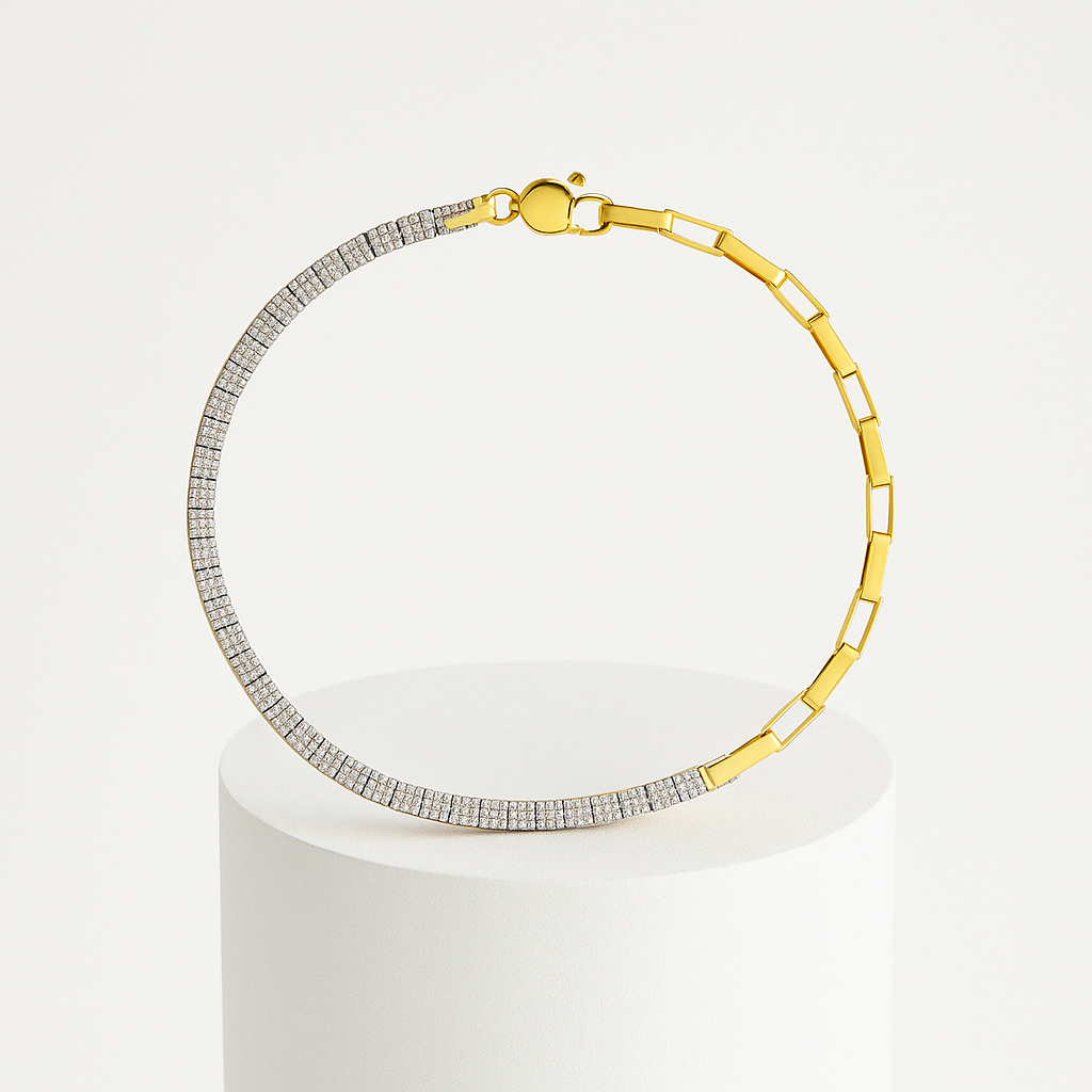 Dual Gleam Kolye, ışıltılı taş detayları ve altın tonlu zincir halkalarıyla hem modern hem klasik bir görünüm sunar. Günlük stilinize sofistike bir dokunuş katmak ya da özel davetlerde göz alıcı bir parça olarak kullanmak için idealdir.