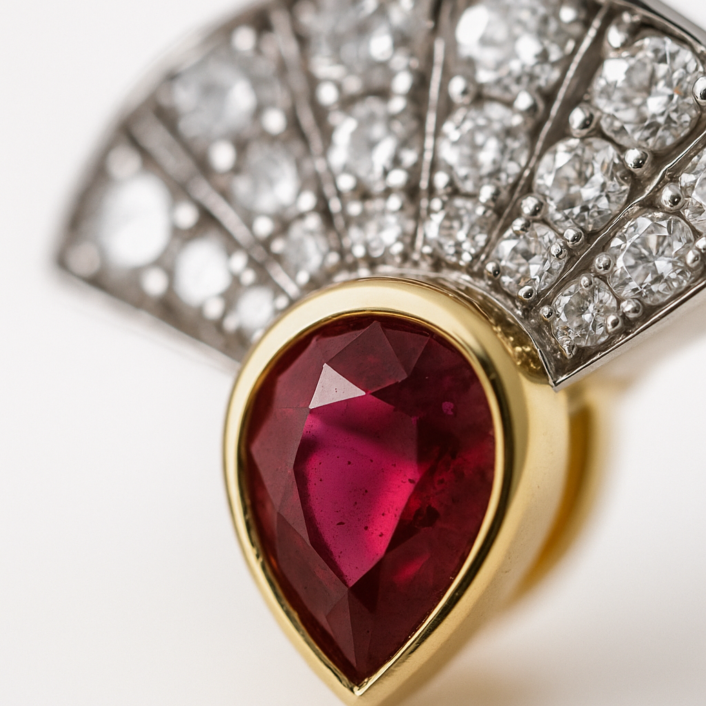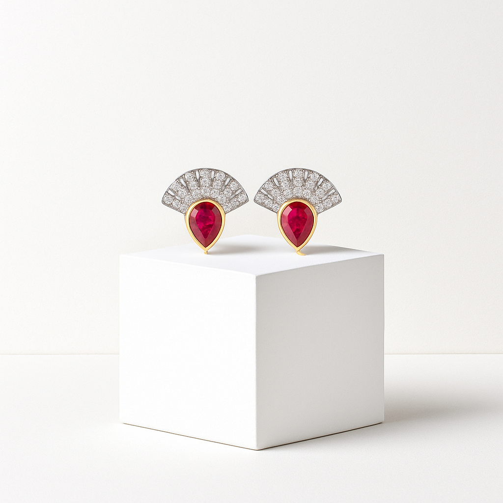 Fanburst Studs, rubinin ateşli kırmızısını art-deco bir yelpazenin keskin geometrisiyle buluşturup kulakta patlayan çarpıcı bir odak noktası yaratır; armut kesim yakut merkez, ışığı içine hapseden zengin tonuyla bakışları ilk anda kilitlerken üstte yarım daire formunda yükselen ince pavé çizgileri, antik tiyatroların taş basamaklarını anımsatan ritmik girintilerle ışıltıyı defalarca kırarak neredeyse stroboskopik bir parlama üretir. Altın tonlu ince çerçeve, yakutun derinliğini zarifçe vurgulayıp tasarıma sıcak bir kontur çizer; bu kontur, metalin soğuk gövdesiyle kristal dokuyu dengelerken aynı zamanda gün boyu matlaşmayan bir ayna etkisi sunar. Küpeler, minimal bir ipek gömlekle gündüz toplantılarına kendinden emin bir renk vurgusu katarken, gece saten elbiseyle buluştuğunda avangard bir taç gibi kulak kıvrımını tahta çıkarır; özetle Fanburst Studs, tek bakışta lüksü imlemeyi tercih eden kadınlara “karar verdim ve sahneye çıktım” cümlesini fısıldar, üstelik bunu abartısız bir incelikle yapar.