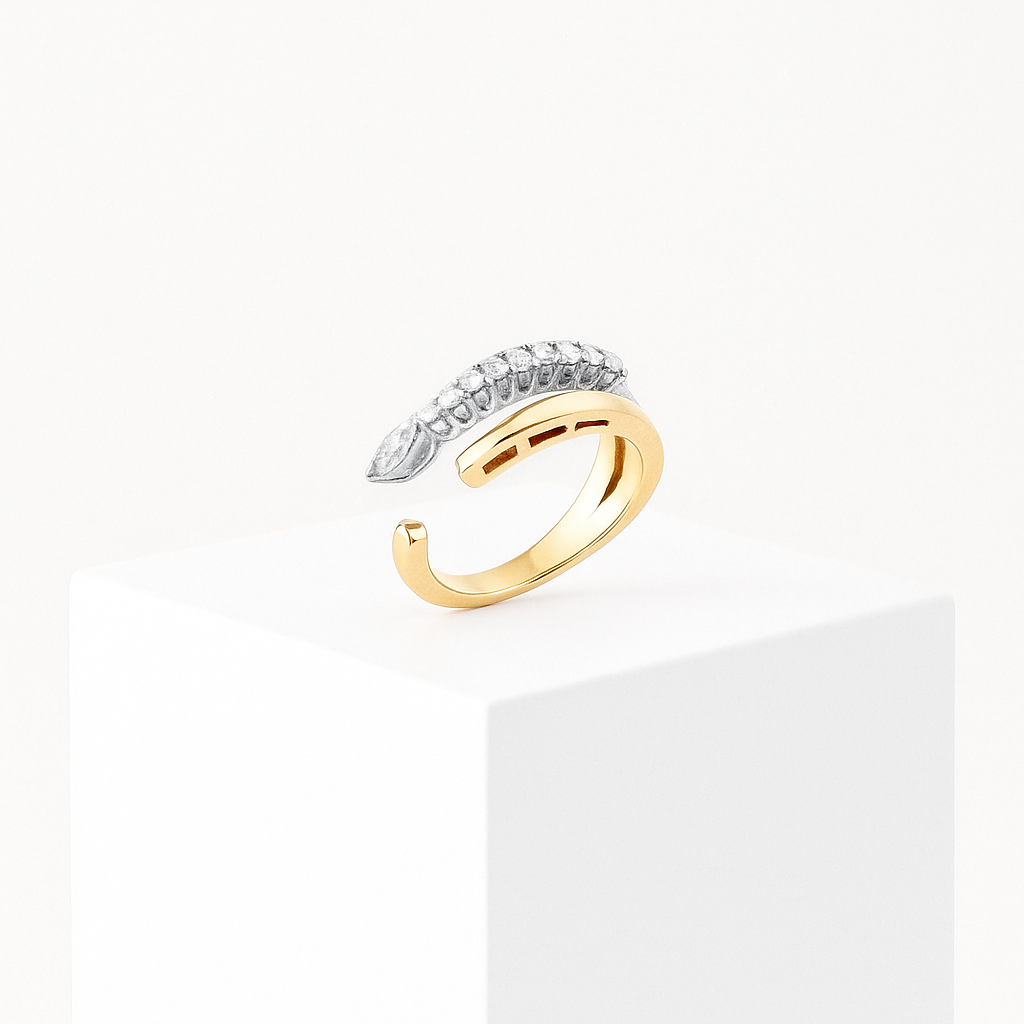 Pırlantaların buz-gibi ışıltısı altının ateşini dengeleyerek her el hareketinde gerilimli bir ışık oyunu yaratır; pullar üzerinde kırılan parıltı, “gevşek” hiçbir an bırakmaz. Ayarlanabilir açıklık yüzüğe takanı kadar özgür kılar—sıkı mı, rahat mı takılacağına sen karar verirsin. İpeksi iç kavis ise heykelsi duruşuna beklenmedik bir konfor katar.