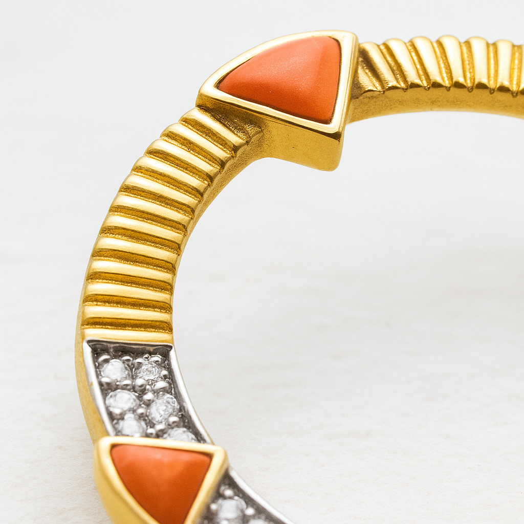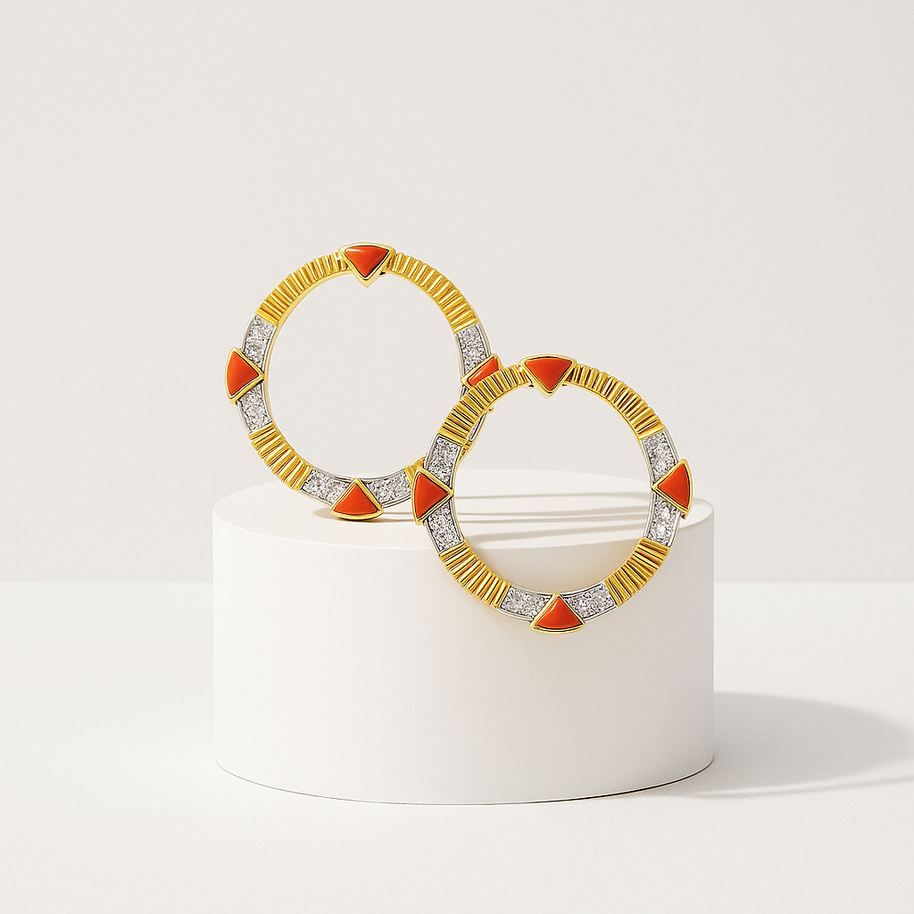 Flame Point Küpe, kesintisiz bir altın halkayı dört ateş ucu gibi parlayan turunç üçgenlerle noktalayarak giyeni anında odak noktası yapar. Metalin ritmik olukları ve araya serpiştirilen pavé ışıltısı, alevlerin titreşen hareketini hatırlatan bir tempo yaratır; küpe kulağınızda sabit durmaz, her baş döndürüşte canlı bir kıvılcım gibi yanıp söner. Tasarımın boş merkezinde hapsolmuş havayı değil, özgüveni taşırsınız—ne fazla, ne eksik; cesurca soyutlanmış bir daire ve tam dört stratejik “flame point”. İster beyaz gömlekle ofiste, ister gece ışıkları altında ipek elbiseyle, bu küpe kendini bağırmadan duyurur: Yanmadan aydınlatmayı bilenlerin simgesi.