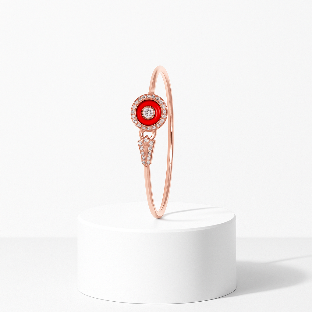 Kırmızının yoğun enerjisi, pembe-altının yumuşak ışıltısıyla dengelenince gündüzden geceye ton değiştiren bir vurgu elde edilir: beyaz keten gömleğe beklenmedik bir sıcaklık, siyah ipek elbiseye sahne ışığı kadar dramatik bir odak ekler. Hafif kavisi sayesinde elde durduğundan çok daha hafif hissettiren Flare d’Éden, bileğinize sade bir hat çizer ama bakışlarda kor alevi gibi kalır—çünkü gerçek lüks, görünür olmadan unutulmaz olabilmektir.