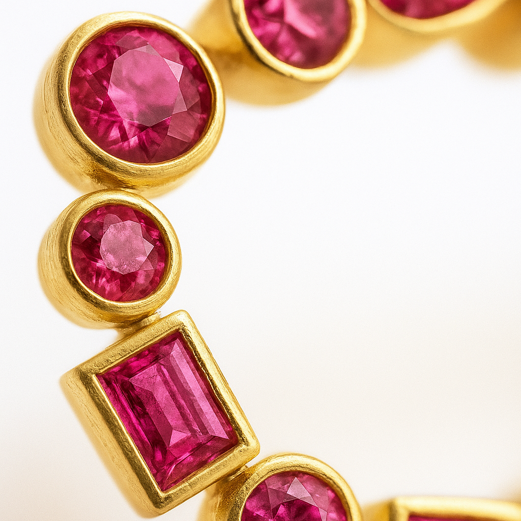 Canlı fuşya taşlar, farklı kesim ve boyutlarda bir yörünge oluşturur gibi zarifçe dizildi. Altın çerçevelerle vurgulanan her taş, ışığı farklı bir açıdan yakalayarak dinamik bir ışıltı sunar. Dairesel form, enerjiyi sürekli içinde döndüren bir akış yaratır; tıpkı modern bir kadının gücü ve özgüveni gibi.