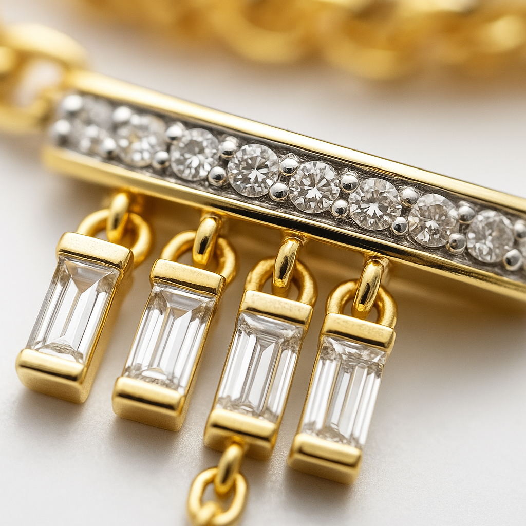 Bileğinizde iki kez dolanan zarif altın zincir, açılış perdesi gibi aralanır ve merkezdeki kavisli bar sahnenin tam odak noktasını oluşturur. Barın üzerinde dizili baguette kesim kristaller, loş bir salonu aydınlatan projektörler misali ışığı tek çizgide toplar; hemen altındaki beş minik sallantı kristali ise düşen spot ışıklarını hatırlatan titreşimler yaratır. İnce bir zincir bu parlak koridordan ayrılıp parmak halkasına kadar uzanır ve eliniz her kıpırdadığında altın bir ışık jeti gibi akıp gider. Hafif yapısı gün boyu konforlu kalırken, ayarlanabilir kilit bileğinizi nazikçe kavrar ve parçanın formunu korur. Glintfall Opera, ihtişamı yüksek sesle değil, pürüzsüz bir solo gibi zarafetle fısıldayan modern bir sahne mücevheridir.