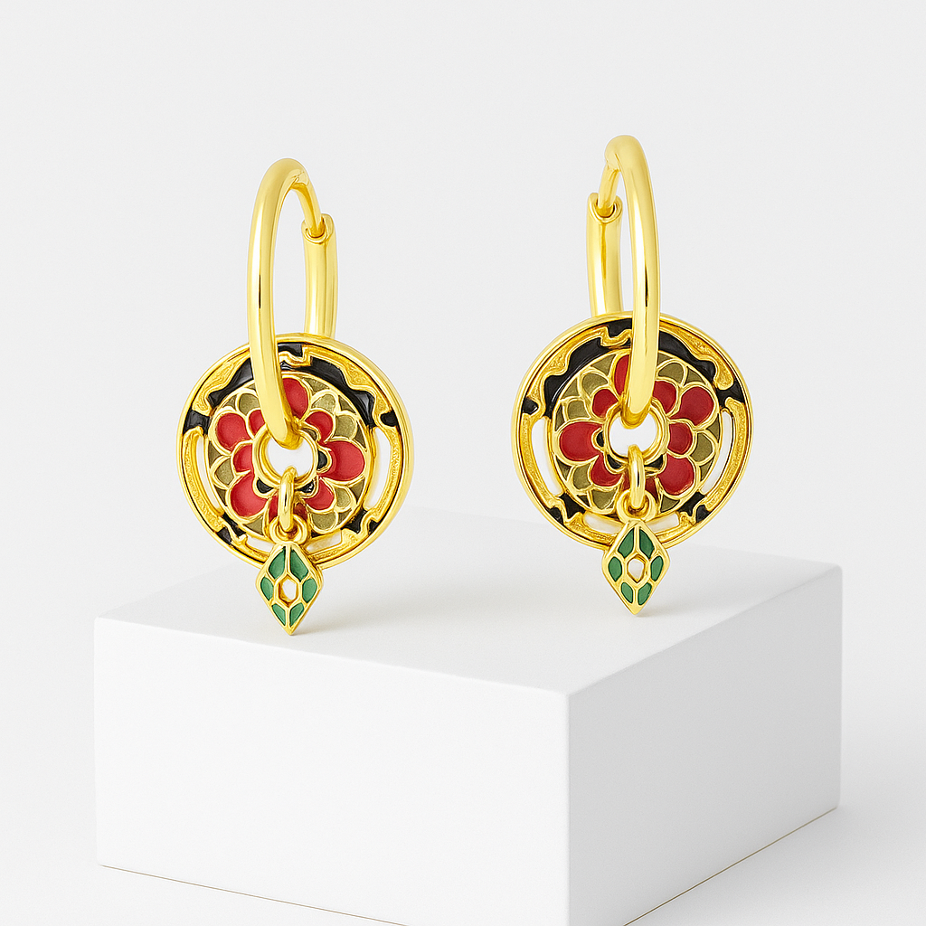 Grenat Halo küpe, ihtişamlı bir çemberin içinde parlayan zarif bir çiçekle güçlü bir siluet sunar. Zengin yakut tonlarını andıran kırmızı detaylar, altın çerçevenin sıcak ışıltısıyla çevrelenirken, merkezden sarkan zümrüt yeşili motif tasarıma dengeli bir kontrast katar.