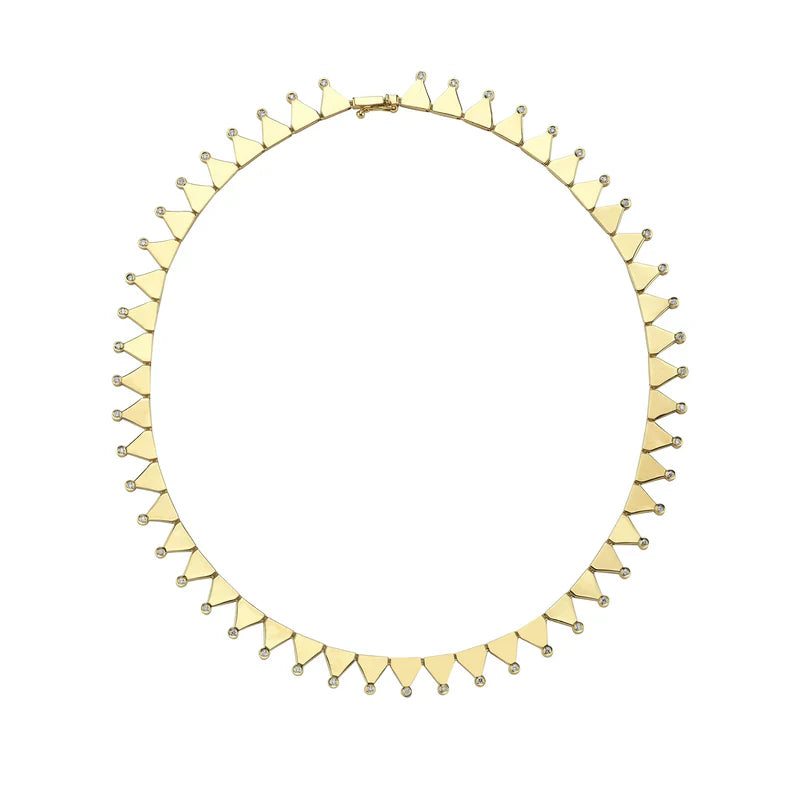 Güneşin ışık saçan zarafetinden ilham alan “Helia Spire Kolye”, üçgen formlu altın parçaların kusursuz dizilimi ve uçlardaki parlak taş detaylarıyla modern bir ihtişam sunar. Işığı her açıdan yansıtan geometrik tasarımı, boynunuzda hem güçlü hem de sofistike bir duruş sergiler. Günlük şıklığa özgün bir enerji katarak, özel davetlerde de zarafetin imza parçasına dönüşür.