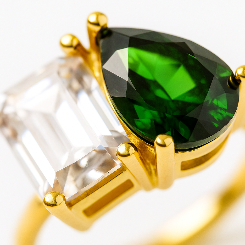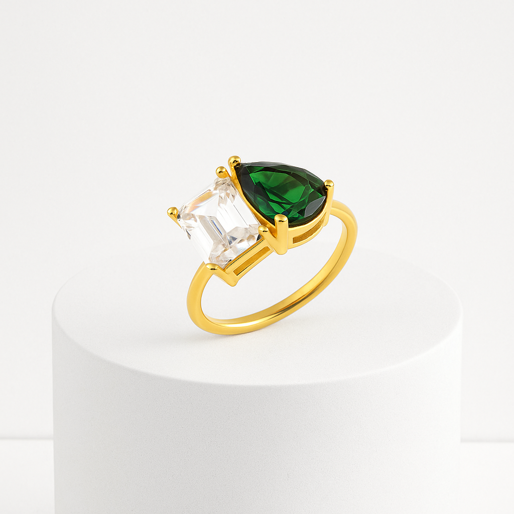 Ormanın serin gölgesi ile kutup parlaklığının tek karede çarpışması: bir yanda çam diplerinden kopmuş damla yeşil, diğer yanda camdan oyulmuş baget beyaz. Altın iskelet bu iki zıt kutbu tek yüzeyde sabitler; taşlar, sanki aynı nabızda atıyormuş gibi birbirine kavislenir. Yüzüğün açık armonisi, parmağa hafif bir asimetri hissi vererek bakışları merkezde toplar; ışık, yeşilin koyu derinliğinden geçip beyaz kristalde yankılanarak geri sıçrar.