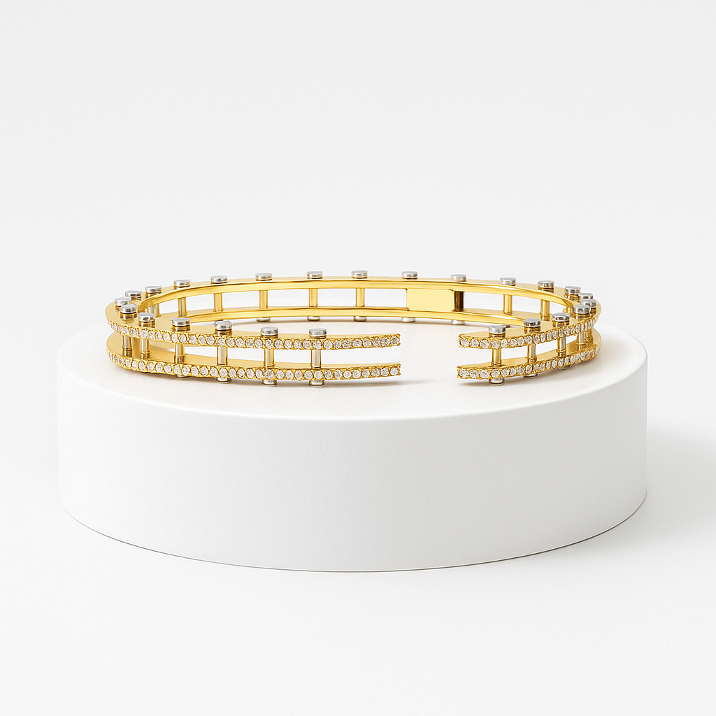IonFlux Kelepçe, adını iyon akışının kesintisiz enerjisinden alan ve Aven & Laurel’in “yarının zarafeti” manifestosunu bileğe taşıyan özgün bir başyapıt. Tasarımın kalbinde, şehir ışıklarıyla yarışan canlı bir altın tonuna gölgeler düşüren mikro kanallar yer alıyor; tıpkı sibernetik devrelerin ince hatları gibi bileği çevreleyen bu oyuklar, eliniz en ufak bir hareketteyken ışığı dalga dalga kırarak takıya dinamik bir derinlik katıyor. Geleneksel bilezik formunun sınırlarını zorlayan yarı esnek omurga, görünmez menteşe sistemiyle birleşerek ikinci bir deri hissi yaratıyor; bu konfor, IonFlux’u gün boyu bileğinizden çıkarmak istemeyeceğiniz rafine bir güç simgesine dönüştürüyor.