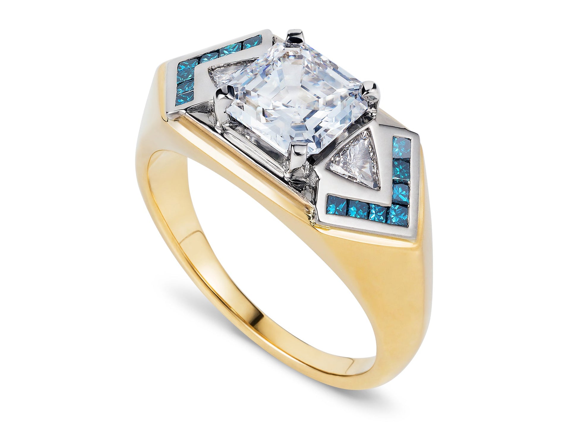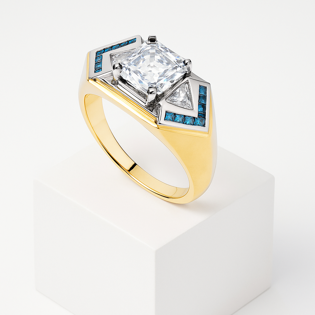 Ionmark, adını fiziksel bir parçacık olan iyondan ve kalıcı bir iz anlamına gelen mark kelimesinden alır. Bu yüzük; merkezdeki büyük dikdörtgen kesim taş, yanlara yerleştirilmiş üçgen kesimler ve mavi taşlarla döşeli simetrik formuyla adeta bir enerji odağı, bir yön tayin cihazı gibi durur.