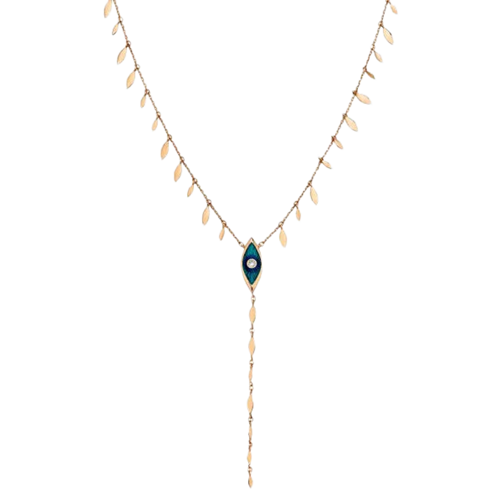Mitolojide gökkuşağının ve ilahi mesajların sembolü olan “Iris”ten ilham alan bu kolye, zarif yaprak detayları ve mistik göz motifli tasarımıyla koruyucu bir aura taşır. İnce zinciri boyunca sıralanan altın yapraklar, her adımda ışığı yakalayarak boynunuzda büyüleyici bir hareket yaratır. Günlük şıklığa sofistike bir dokunuş katarken, özel davetlerde de dikkat çeken bir parça olur.