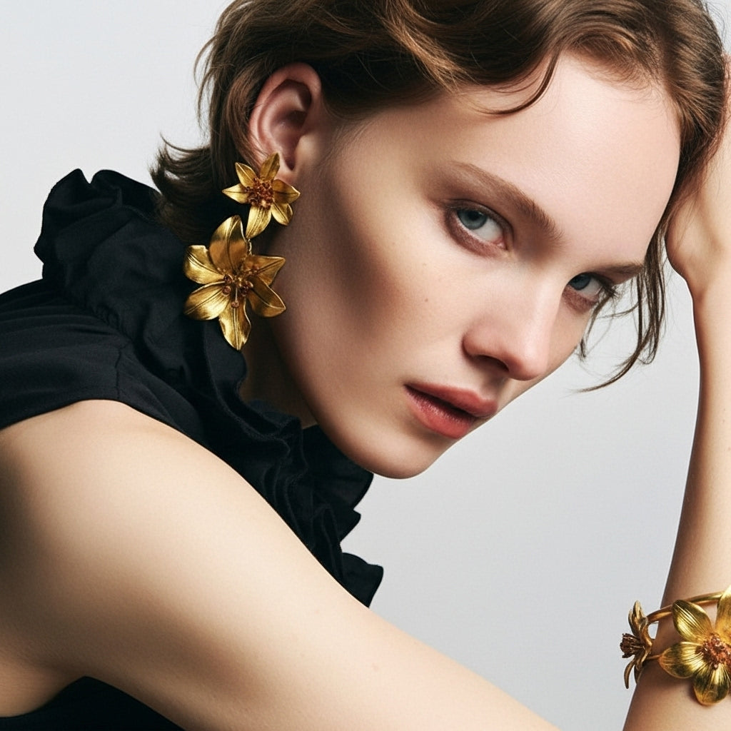 Doğanın en zarif çiçeklerinden ilham alınarak tasarlanan Lilium Grace Küpe, altın dokusuyla zamansız bir ihtişam sunuyor. Katmanlı lale formu ve ortasında yer alan ince taş detaylarıyla romantik bir dokunuş katarken, modern ve güçlü çizgileri sayesinde özel davetlerden günlük stile kadar her an parıltınızı öne çıkarıyor.