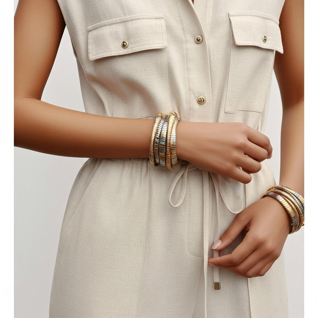 Linéa Bicolore Bileklik, altın ve gümüş tonlarının zarif uyumunu modern bir yorumla sunar. Spiral formdaki dokusu sayesinde bileğe rahatça otururken, iki rengin kontrastı sofistike bir görünüm kazandırır. Hem gündelik kullanımda hem de özel davetlerde stilinizi tamamlayacak güçlü bir aksesuar olarak öne çıkar.