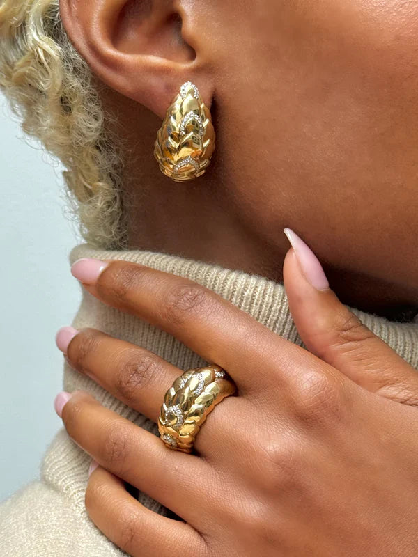 Asaletin ve yeniden doğuşun simgesi lotus çiçeğinden ilham alan “Lotus Crest Küpe”, altın yüzeyi ve pırlanta detaylarıyla ihtişamlı bir görünüm sunar. Güçlü formu zarafetle birleşerek her adımda ışığı yakalar, kulakta adeta bir taç gibi durur. Özel davetlerden günlük şıklığa kadar her stile uyum sağlayan bu parça, zamansız bir ihtişamın sembolüdür.