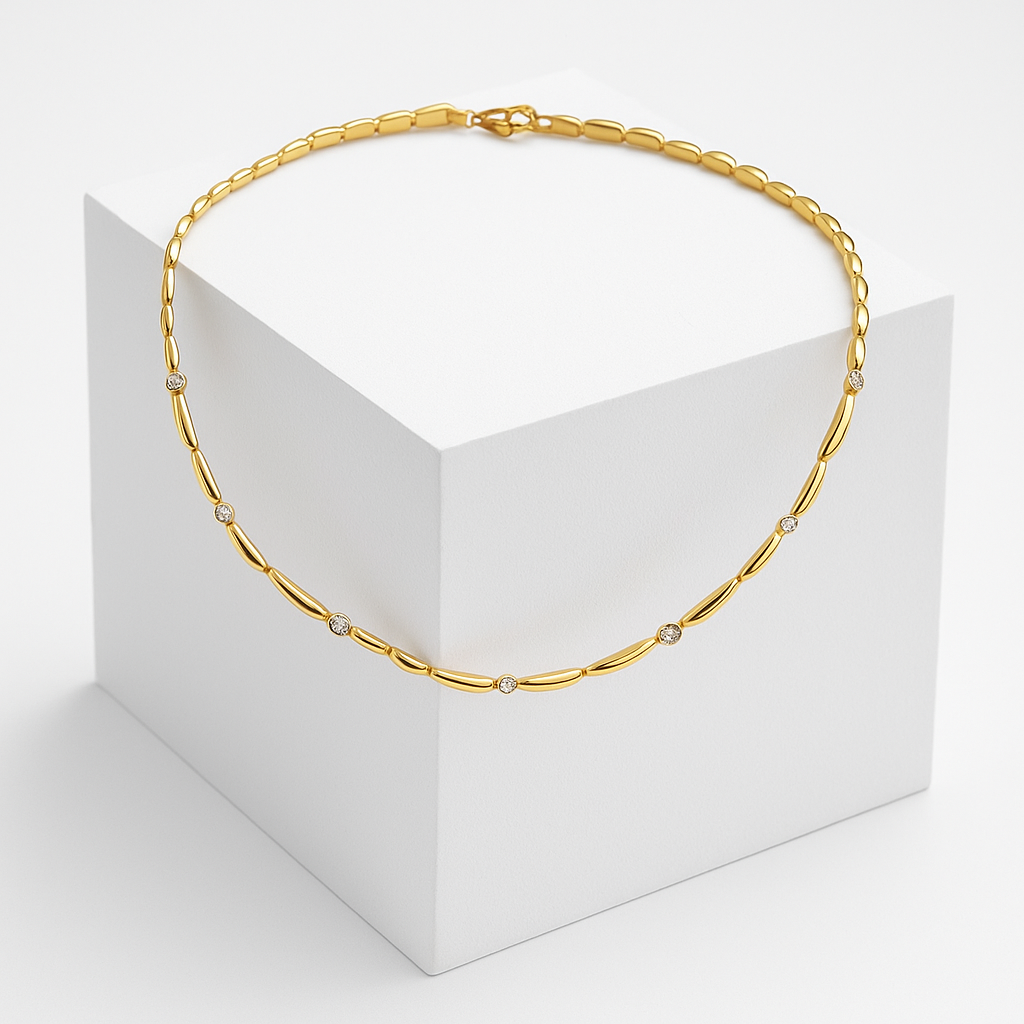 Lumière kolye, zarif altın dokusu ve ışıltılı taş detaylarıyla saf ışığın asaletini yansıtıyor. İncelikle tasarlanmış formu, hem günlük şıklık hem de özel davetler için mükemmel bir tamamlayıcı sunarken, zamansız tasarımıyla her stile uyum sağlıyor. Işığın büyüsünü üzerinizde taşımak için ideal bir seçim!