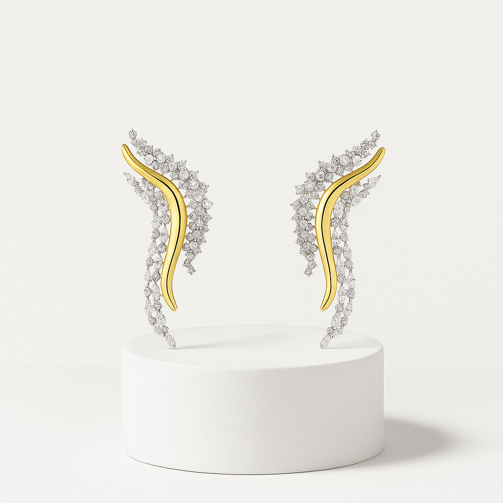 Kulak memesinden yukarı doğru tek çizgide yükselen altın bir ışık darbesi. İnce gövde, fırçayla atılmış keskin bir “swoop” gibi kıvrılır; kenarından taşan pırlanta bulutuysa fırça ucundan sıçrayan boya damlalarının ışıltılı versiyonu. Her minik taş, altının sıcak tonuyla kontrasta girerek yıldız tozu hissi yaratır—başınızı çevirdiğinizde bu toz, dalganın etrafında spiral bir iz bırakır.